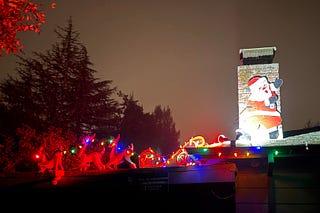 Up on the rooftop, reindeers pause, out jumps good ol' Santa Claus