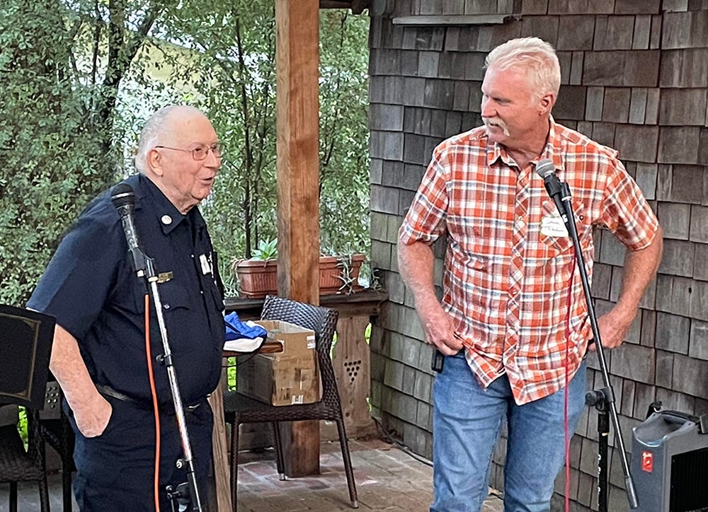 Assistant Fire Chief Steve Thibodeau gave a brief introduction to their service to the department. “Ray started in 1979 and served the community through the late 90s, and then he went to a reserve position. And you would think once you go to a reserve position that you would kind of slow down a little bit. Well, Ray didn’t slow down at all. He and Joe took on the hydrant program in Sebastopol—so all those cool-looking silver and blue hydrants you guys see around town, this man right here, Ray and Joe Pogar flow tested those, painted them, and took care of all those hydrants for years and years and years.”