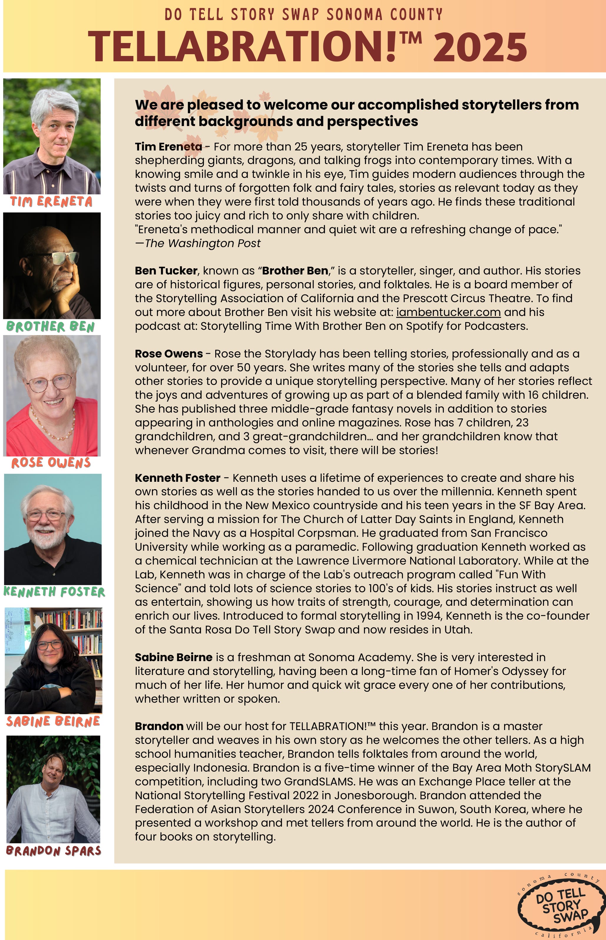 I learned about Do Tell Story Swap from Beth Wakelee, who’s lived in Sebastopol for 50 years. She dropped by the Sebastopol Times office last week to tell me about an upcoming international storytelling event called “Tellebration” that Do Tell Story Swap will be hosting on Nov. 11. (See the flyer at the end of this article.)