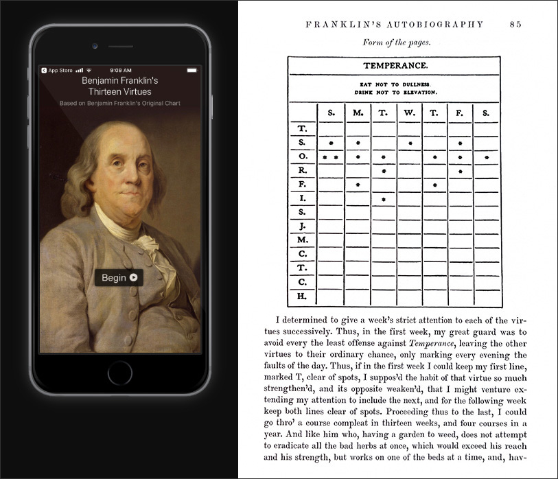 I determined to give a Week’s strict Attention to each of the Virtues successively. Thus in the first Week my great Guard was to avoid every the least Offence against Temperance, leaving the other Virtues to their ordinary Chance, only marking every Evening the Faults of the Day. Thus if in the first Week I could keep my first Line marked T clear of Spots, I suppos’d the Habit of that Virtue so much strengthen’d and its opposite weaken’d, that I might venture extending my Attention to include the next, and for the following Week keep both Lines clear of Spots. Proceeding thus to the last, I could go thro’ a Course compleat in Thirteen Weeks, and four Courses in a Year. And like him who having a Garden to weed, does not attempt to eradicate all the bad Herbs at once, which would exceed his Reach and his Strength, but works on one of the Beds at a time, and having accomplish’d the first proceeds to a Second; so I should have, (I hoped) the encouraging Pleasure of seeing on my Pages the Progress I made in Virtue, by clearing successively my Lines of their Spots, till in the End by a Number of Courses, I should be happy in viewing a clean Book after a thirteen Weeks daily Examination.