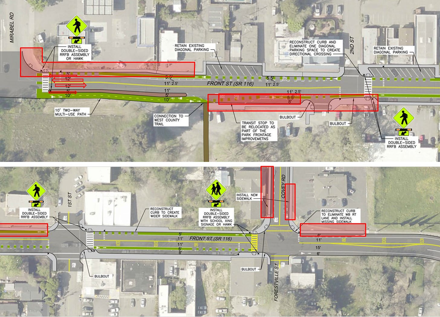 We believe families, youth and less confident riders are better served on our low-traffic side streets where they can safely access downtown businesses, Forestville Youth Park, Oaks Park and the West County Trail using the new signalized crosswalks to safely cross Highway 116. Again, bike racks will be available to park your bicycle and walk to nearby businesses.