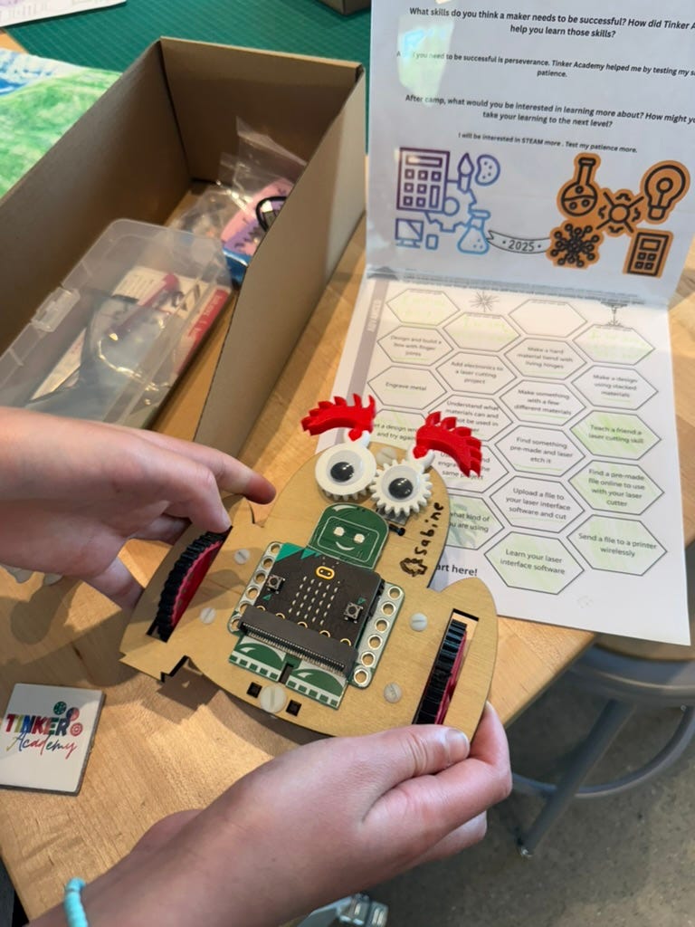 Last Friday at the Santa Rosa Junior College’s Innovation Center, the four-day-long Tinker Academy was wrapping up. The organizer, Casey Shea, greeted parents who came to see what their kids have been making. Each of the 24 kids, who ranged in age from 10 to 14, left Tinker Academy with a silly-looking robot that they had built from laser-cut and 3D-printed parts and which had a Micro:bit as its brain.