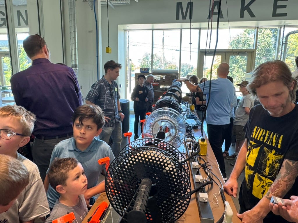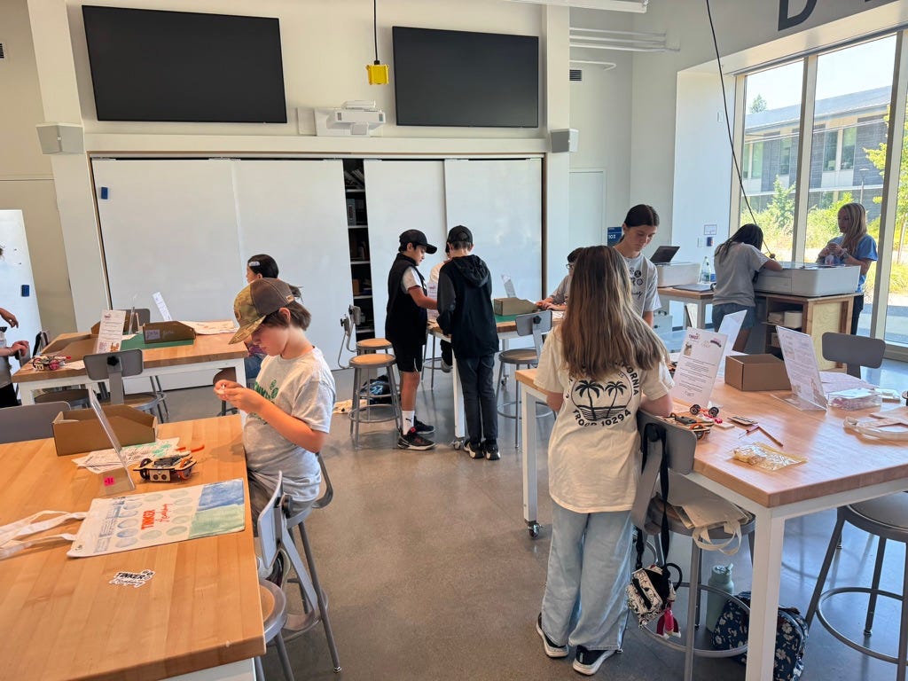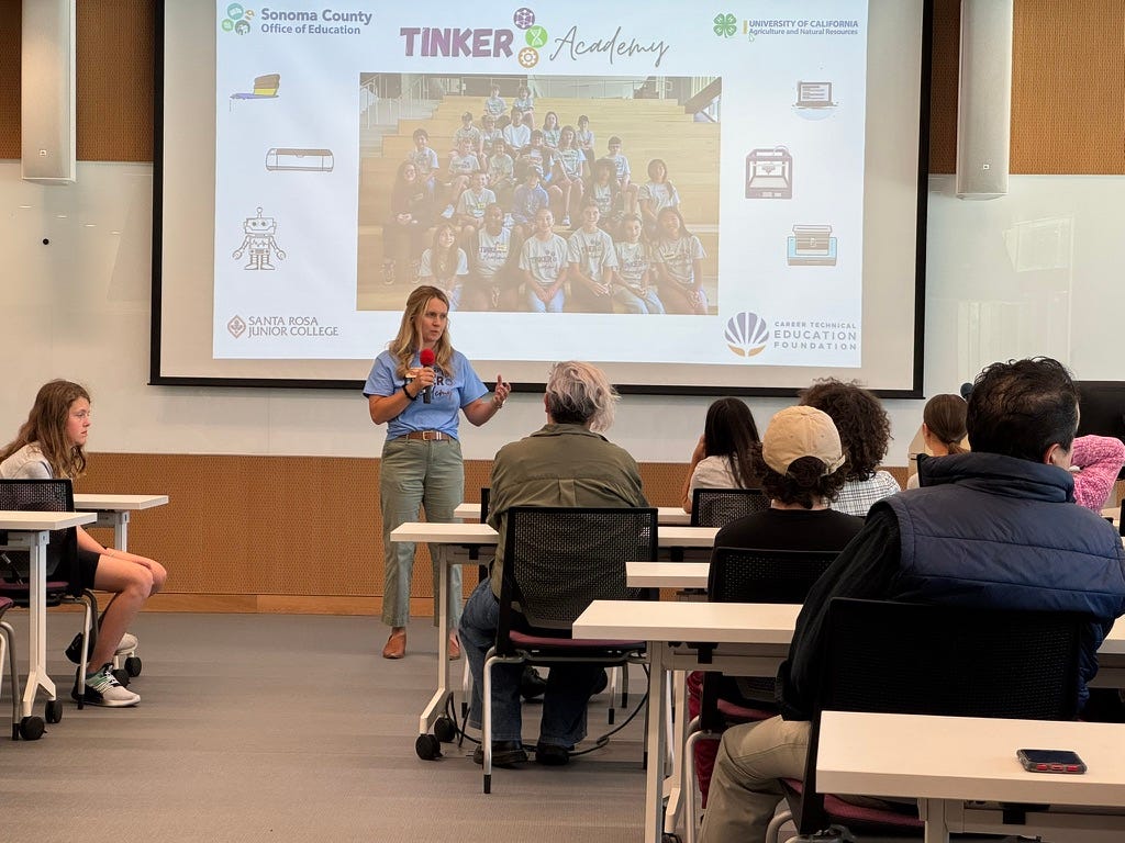 Shea, who works for the Sonoma County Office of Education, put together Tinker Academy to give kids the opportunity to learn new tools and engage in making. His daughter Cori, who is a 4th-5th grade teacher at Oak Grove, worked with him. She told parents that their kids were awesome and that working with them was the favorite thing she will do for her summer. Gary Jordan, a retired middle school teacher, also helped out. The SRJC made the new Innovation Center available.