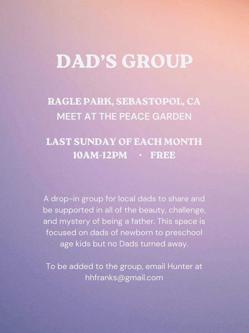 “I was a new dad about six months into the journey here in Sebastopol, and I was really seeking to have a space to gather with other dads, particularly newer dads, and be able to share some of what’s happening in my life and in my experience with fatherhood and parenting and also hear from other dads,” he said during a recent interview. “Just creating a space where I felt a little less alone at times, and [sharing] all the challenges and also all of the joys and the beauties [of being a dad] as well.