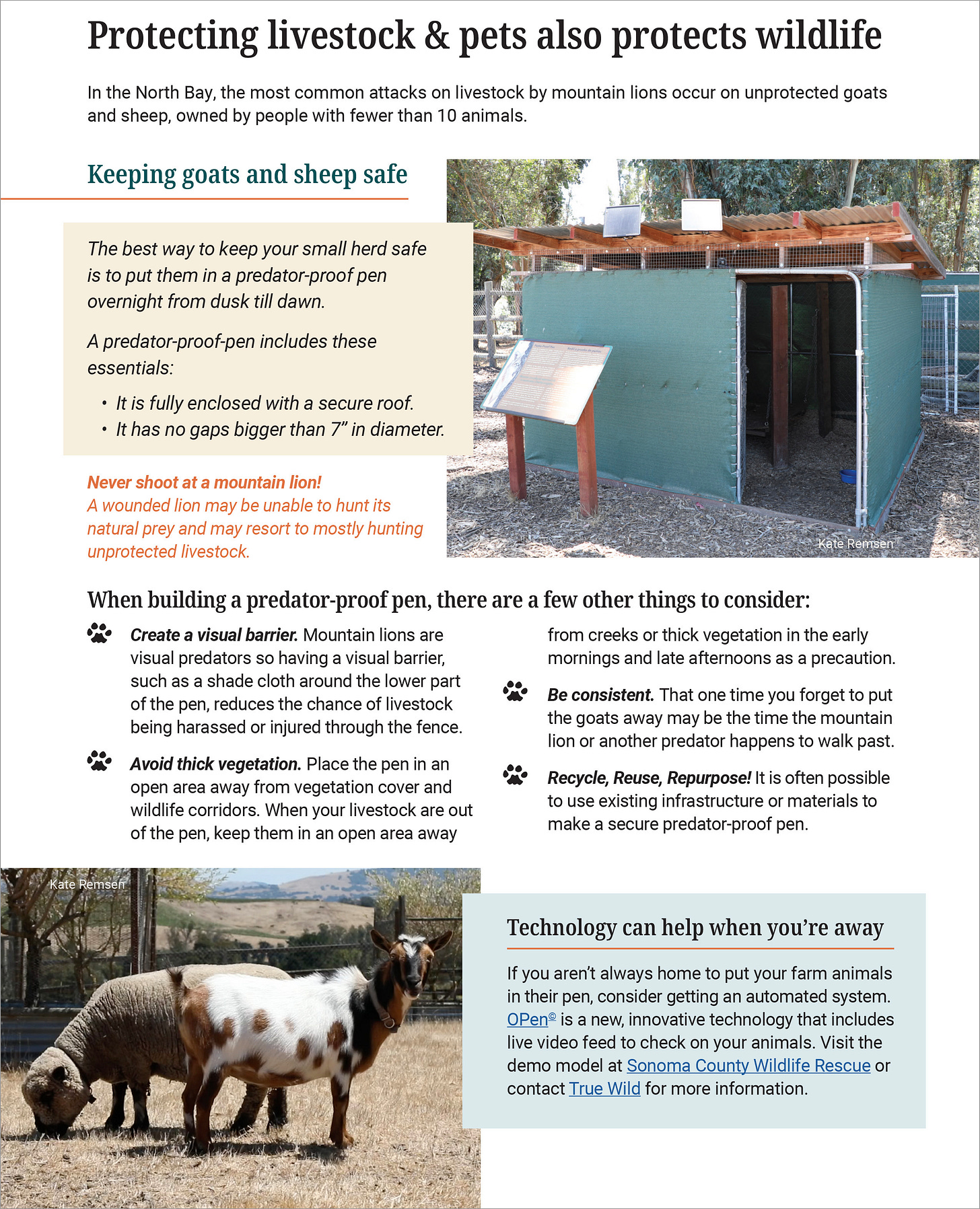 Martins would like to get the word out about how homeowners and small hobby farm owners can protect their animals from predation by mountain lions. There’s a useful guide, Coexisting with mountain lions: A guide for pet and livestock owners of the North Bay, on his website.