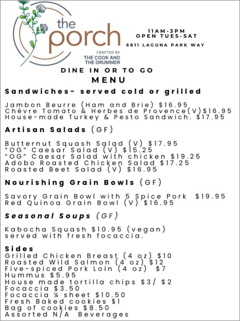 The Porch, which is open Tuesday to Saturday, 11 am to 3 pm, is located at 6811 Laguna Parkway. Find out more about their work at The Cook and the Drummer and follow them on Instagram or Facebook.
