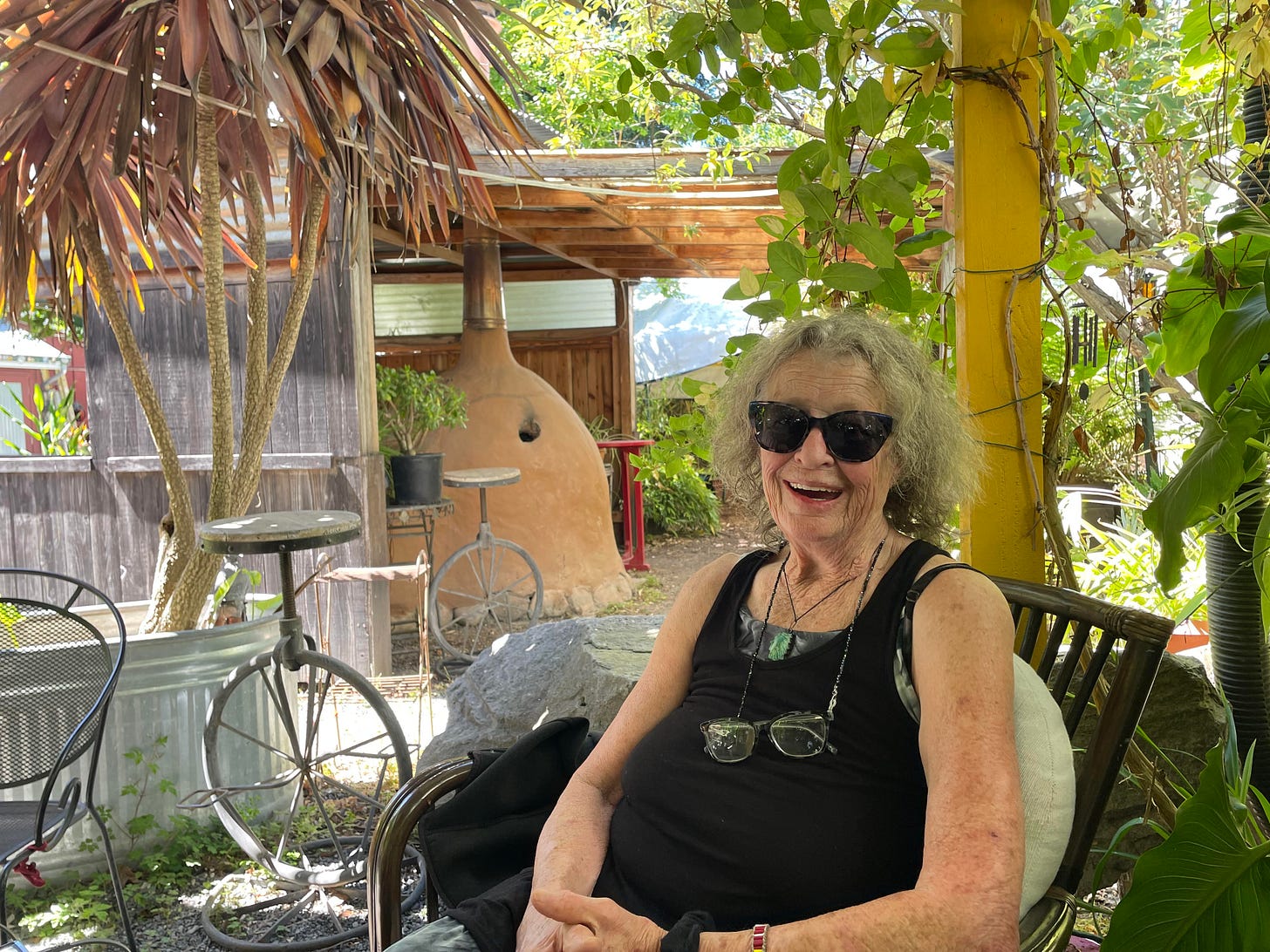Her friend Ron built most of the outdoor structures. When Miguel Elliot built a pizza oven out of cob on the property, it needed a structure to protect it from the weather, and Ron built that too.