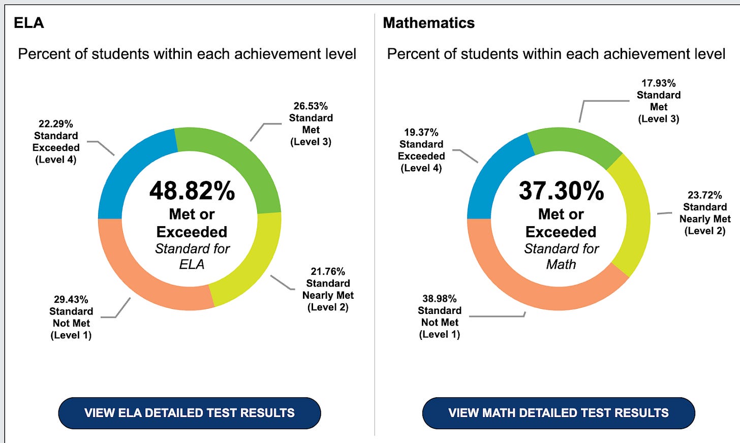 There are 5.8 million students in California public schools at all levels from TK through 12th grade. Here are the statewide results for all grades and all schools for English Language Arts (ELA) and Math.