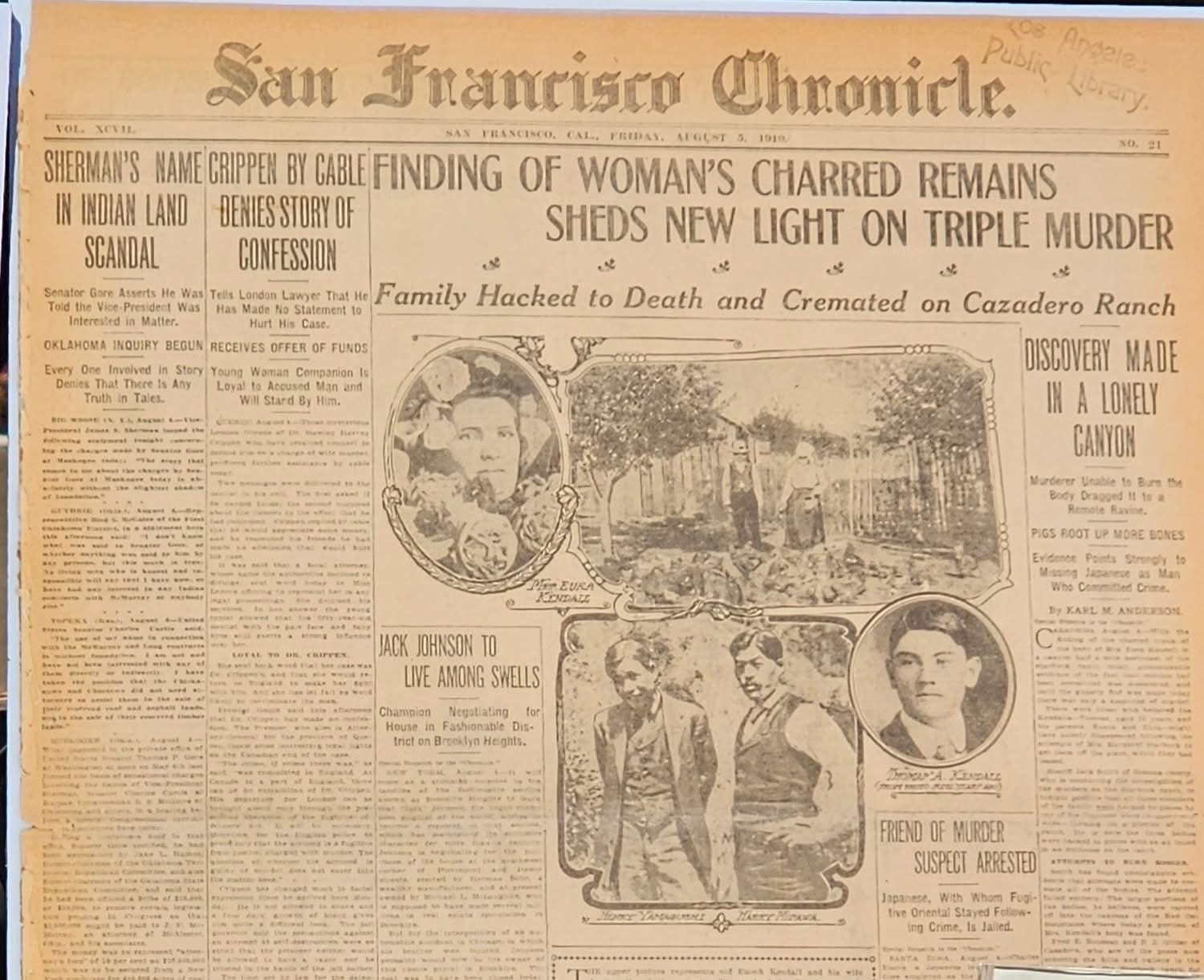 The story starts on July 31, 1910, when a posse found that three members of the Kendall family had been brutally murdered in or around their Cazadero home on the Ingram Ranch. The murderer had attempted to dispose of the bodies, so the posse found only bones and ashes and blood stains. The main suspect was Manjiro Yamaguchi, a Japanese man in the hire of Margaret Starbuck of Oakland.