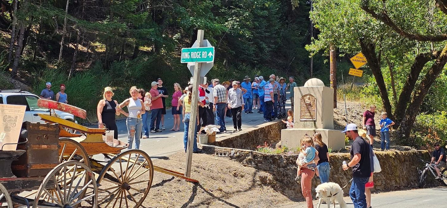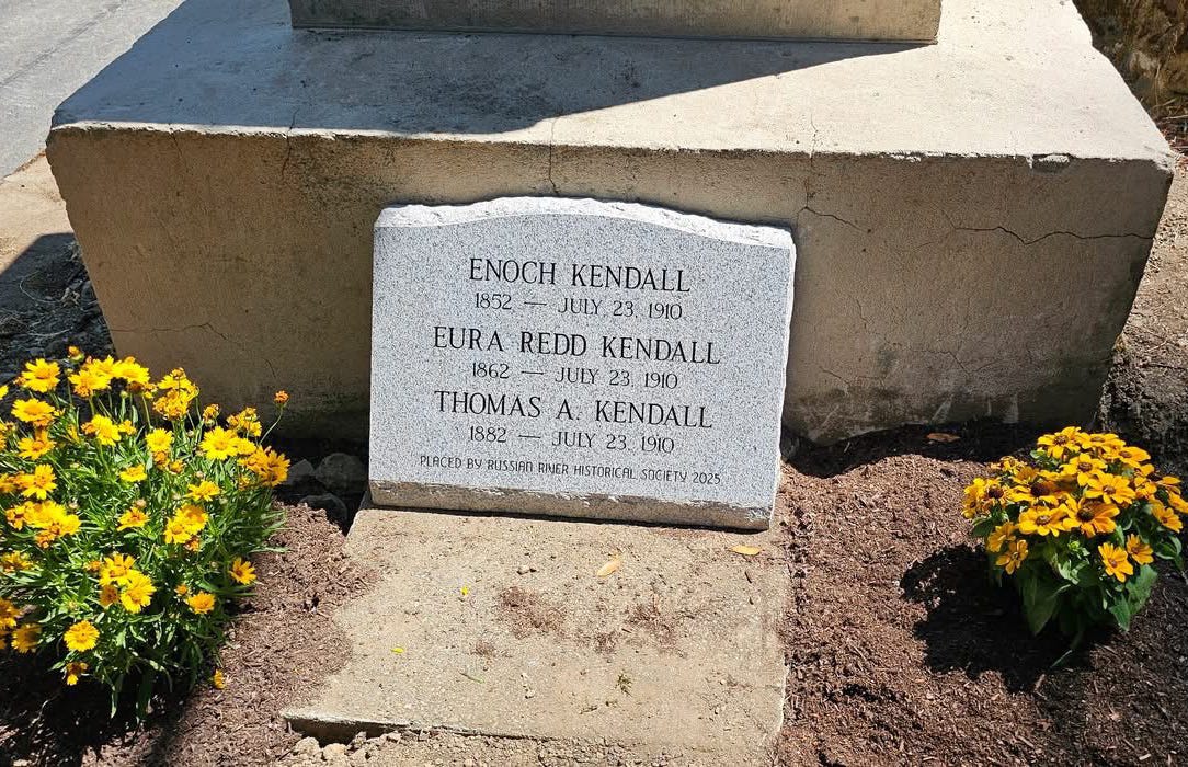 Fifty years later, which is to say Sunday, August 10, 2025, people came from far and near for Cazadero Hometown Days. They enjoyed a pancake breakfast, a fundraiser of the Cazadero Community Club, and gathered to set a proper marker at the Kendall’s grave.