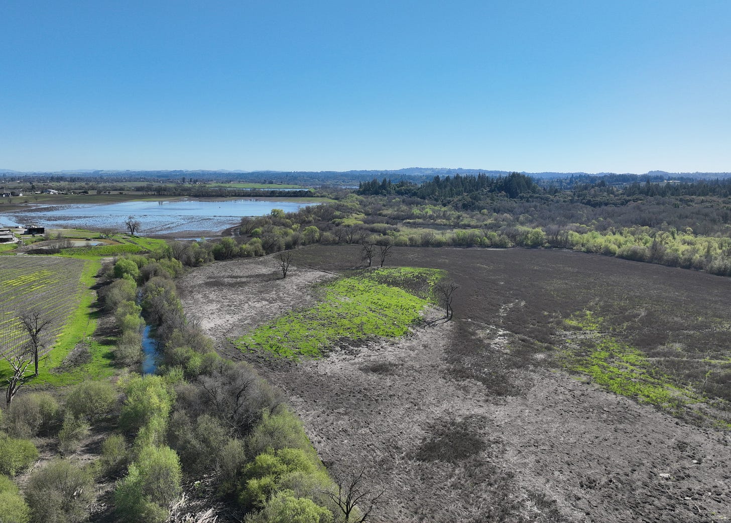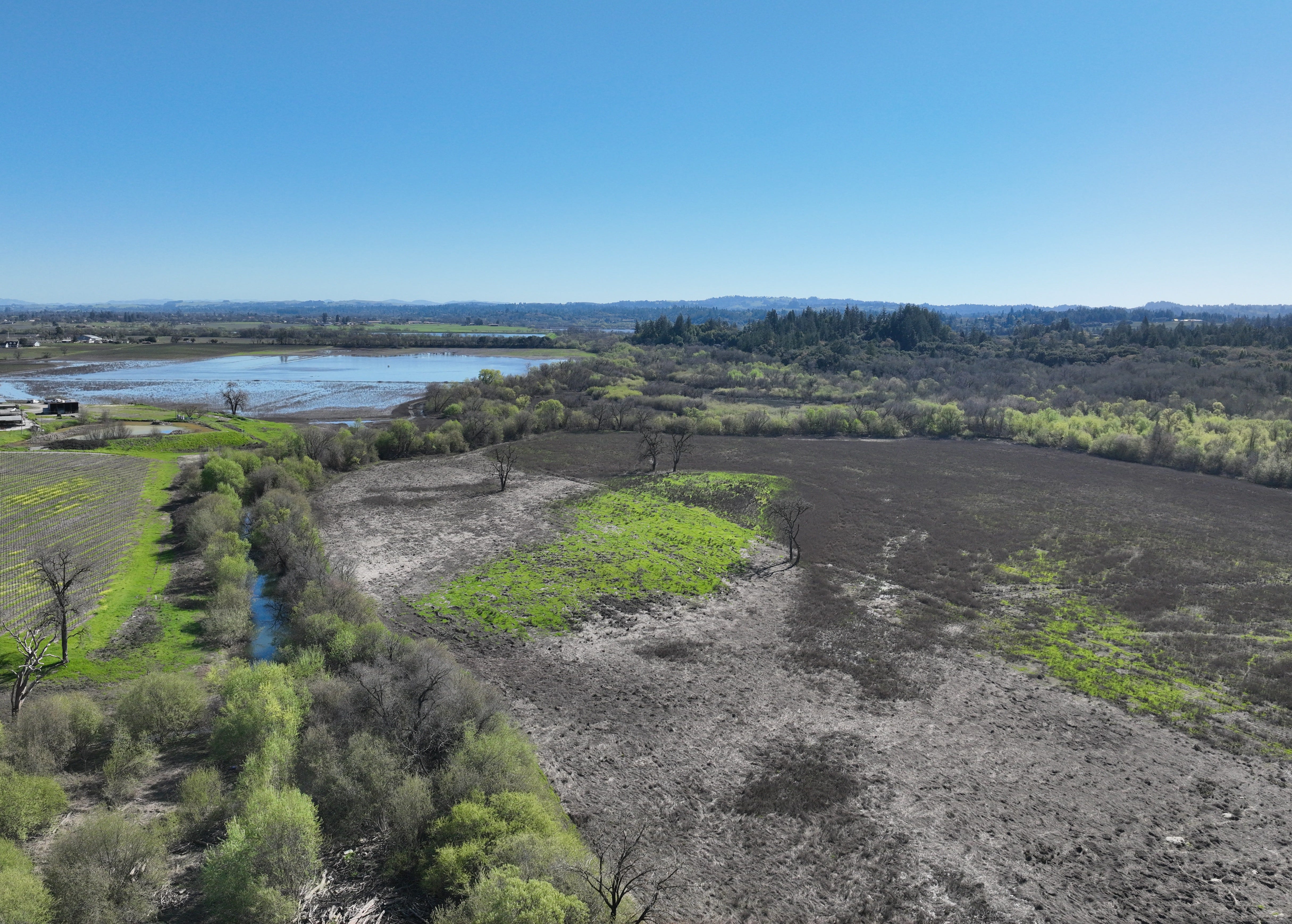 Currently, the site consists of 119 acres of farmed wetland, producing corn; 40 acres of converted farmland now left fallow with periodic plowing to control invasive weeds; a degraded 16-acre oak woodland; and strips of mixed riparian forest. Vineyards border the site to the east, and the west bank of the Laguna is dominated by riparian forest and rural residential properties.