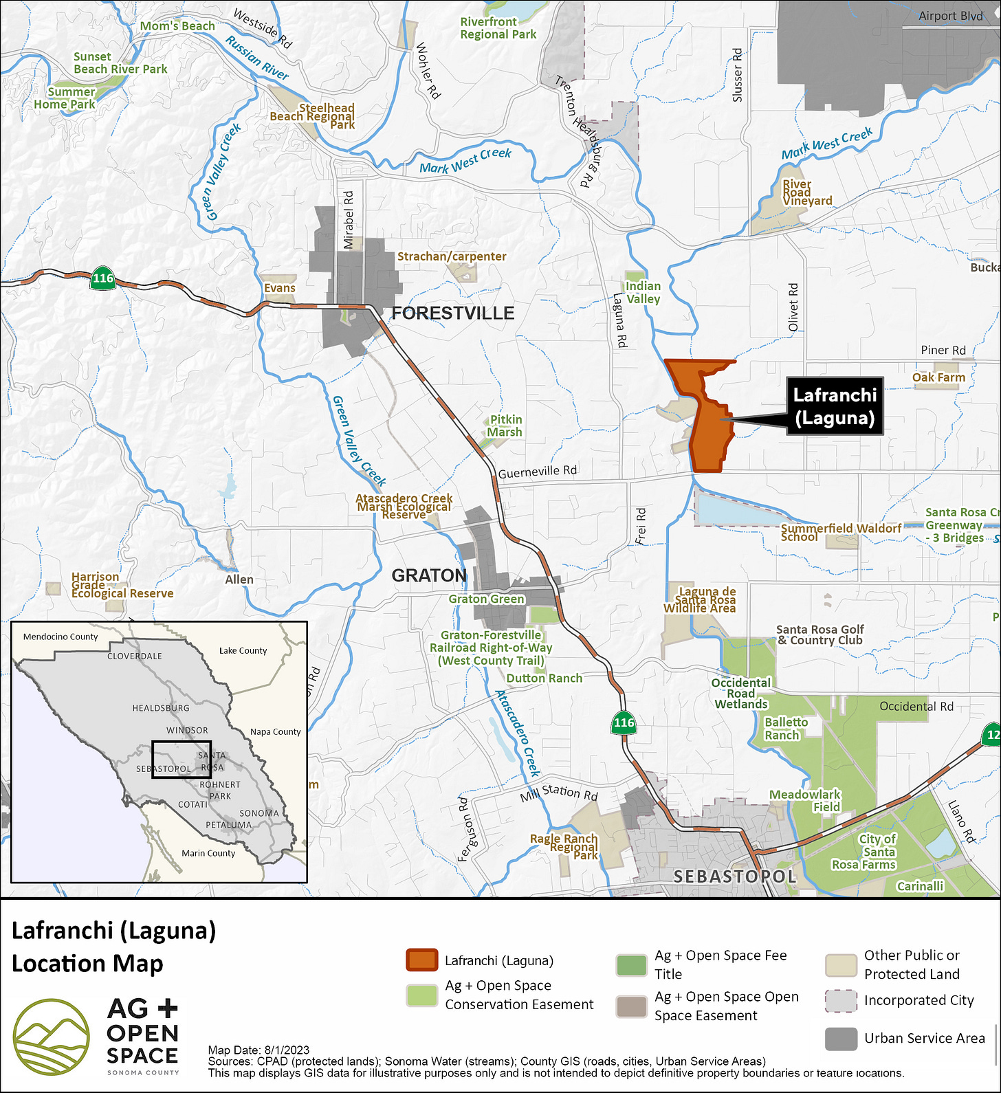 The grant project is located on the Lafranchi Ranch, off Guerneville Road, which the family has owned and farmed for three generations. The Sonoma County Ag + Open Space secured a conservation easement on a portion of the ranch in 2024, ensuring its permanent protection.