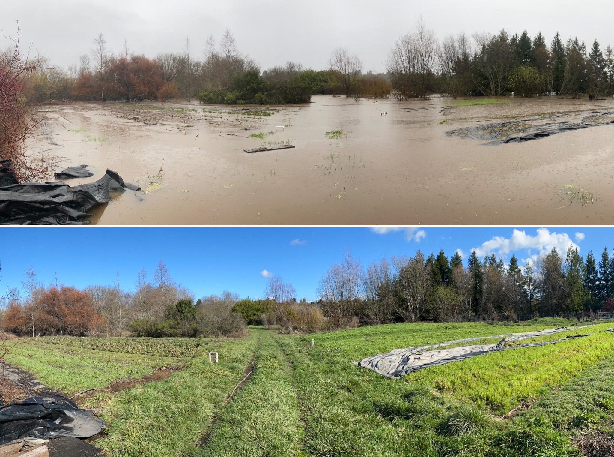 We farm on the side of the Atascadero valley bottom, a flood plain. This is no surprise; this is Mother Nature’s way of slowing and sinking the water. It doesn’t work as well because instead of a meandering marshy area, the Army Corps of Engineers dug a channel which we now know as the Atascadero Creek and made most of this land passable and farmable. Atascadero is a Spanish word for wet muddy place and it used to be like a smaller Laguna de Santa Rosa.With the valley as it is, we’re ready for the flood every year, and most years we flood a little, but it’s not been to the high water mark in 2 years. We do not grow food crops in these fields in the winter for if flood water comes in the crops are no longer food safe. We instead plant cover crops in these beds. This year, thanks to a dedicated crew, we have more beds in cover crops and more kinds of cover crops than ever before. So if you look at the photos you’ll see green grass 6-18” tall and you may wonder where the fields are. This green grass is a mix of oats, rye, barley, peas, vetch, clovers, and more! These work to feed the soil through winter photosynthesis, but also hold the soil in place with their roots in these times of flood. The water recedes, and being good and healthy soil—with high soil organic matter that can hold spaces for air and infiltrate water—there is no damage. And so it looks as good as new (albeit a little muddy).