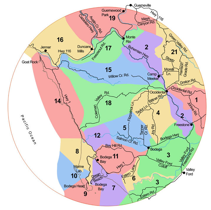 Equipped with binoculars, spotting scopes, thermoses of hot coffee and warm clothing, last year’s birders spread out in small teams to cover many of West County’s unique habitats, including the Sonoma Coast, Bodega Bay and the estuary of the Russian River; the deeper redwood forests along Willow, Austin and Green Valley creeks; the higher meadows along Joy Road, Freestone, Harrison Grade; and, the environs surrounding Graton and Sebastopol, among a few other locations. The map below shows the bird count areas for West County.