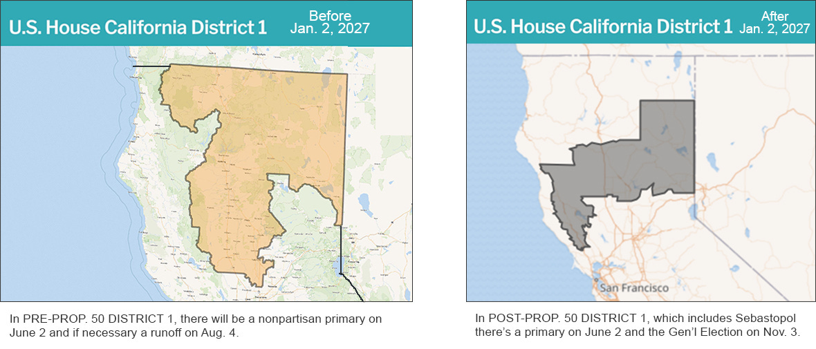 There will be a Primary on June 2 and a General Election on Nov. 3 for the newly configured District 1, created by Prop. 50—the so-called “Election Rigging Response Act,” which was California Governor Gavin Newsom’s response to Republican gerrymandering in Texas. The winner will serve a two-year congressional term, starting in January 2027. Voters in Sebastopol, Graton, Forestville and everyone else in the new District 1 will vote in this election.