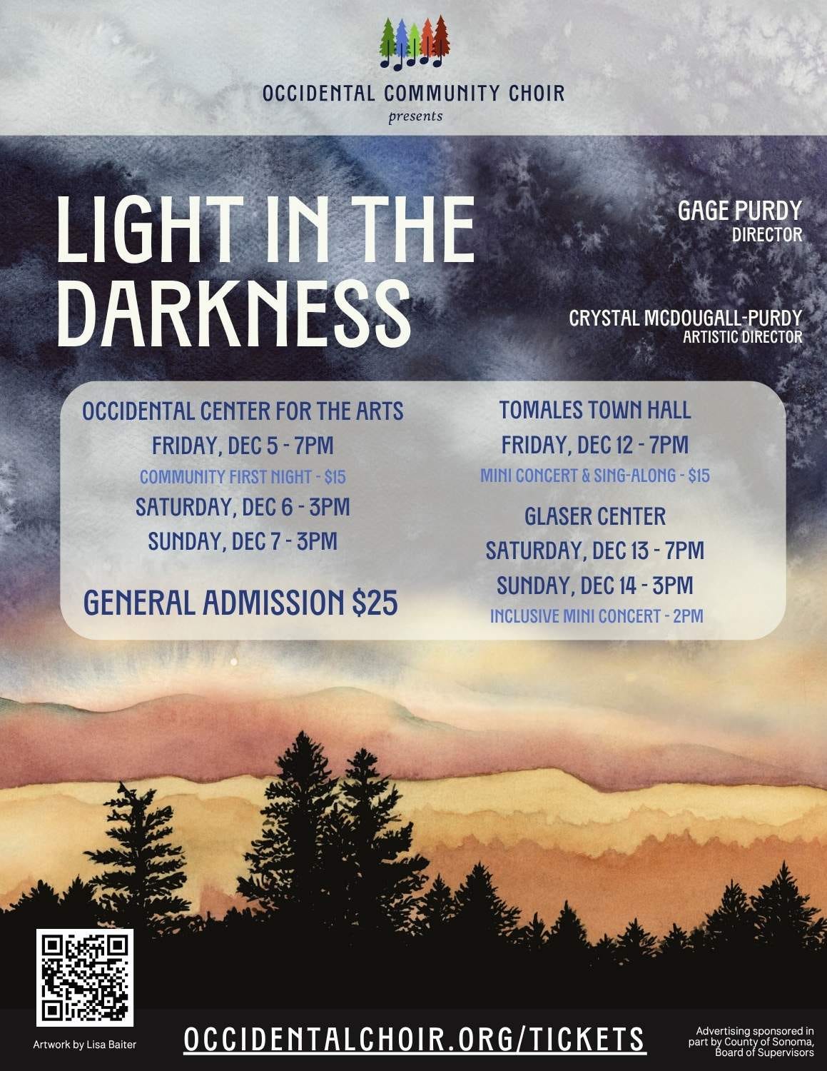 Describing the current concert, the group’s website says, “‘Light in the Darkness’ is about seeking and creating light when the world feels dim. It’s about music as a lantern: something we carry together, passing its glow from one heart to another. Our program will take us through moments of stillness, struggle, wonder, and celebration with each song as an ember that can ignite hope. This season’s music will remind us that even in the longest night, the promise of dawn is real. We sing them not as individuals, but as a single, many-voiced instrument, resonating with courage, compassion, and joy. So come ready with your openness and light.”