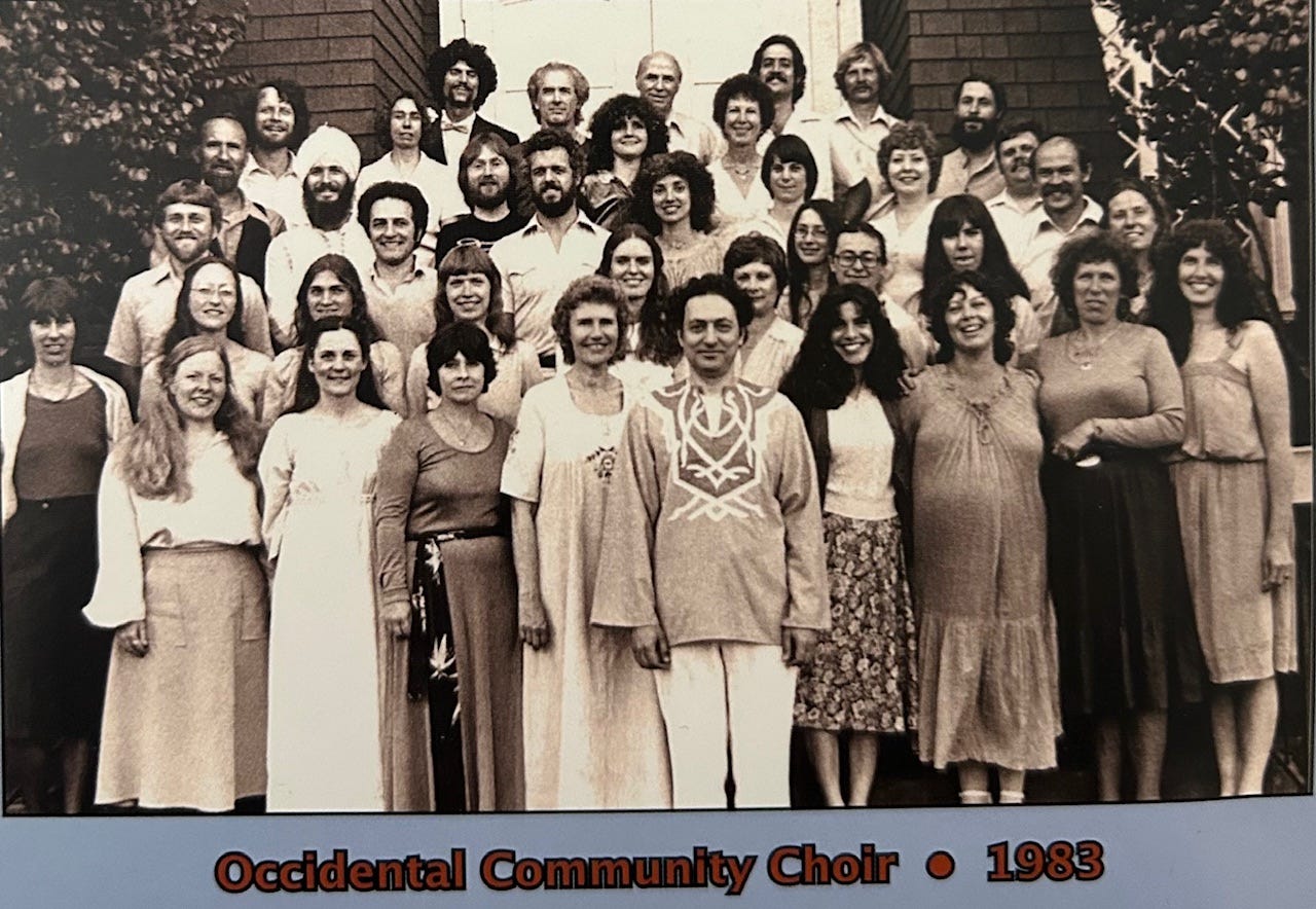 The legendary beginning of the Occidental Community Choir took place around a bonfire in downtown Occidental in 1978, when a small group of locals got inspired to expand their evening harmonies into a more formal setting. They soon began regular rehearsals, first in someone’s home and later at the Occidental Community Church. Its members were mostly new arrivals to western Sonoma County, a younger wave of Baby Boomers seeking new paths to community. Some of the original members of the choir were inhabitants of Occidental’s famed hippie communes such as Morningstar, Wheeler Ranch and others. At a time when an emerging American counterculture was searching for a new drumbeat, the new wave of longer-haired Occidental inhabitants settled on sharing some bonfire harmonies.