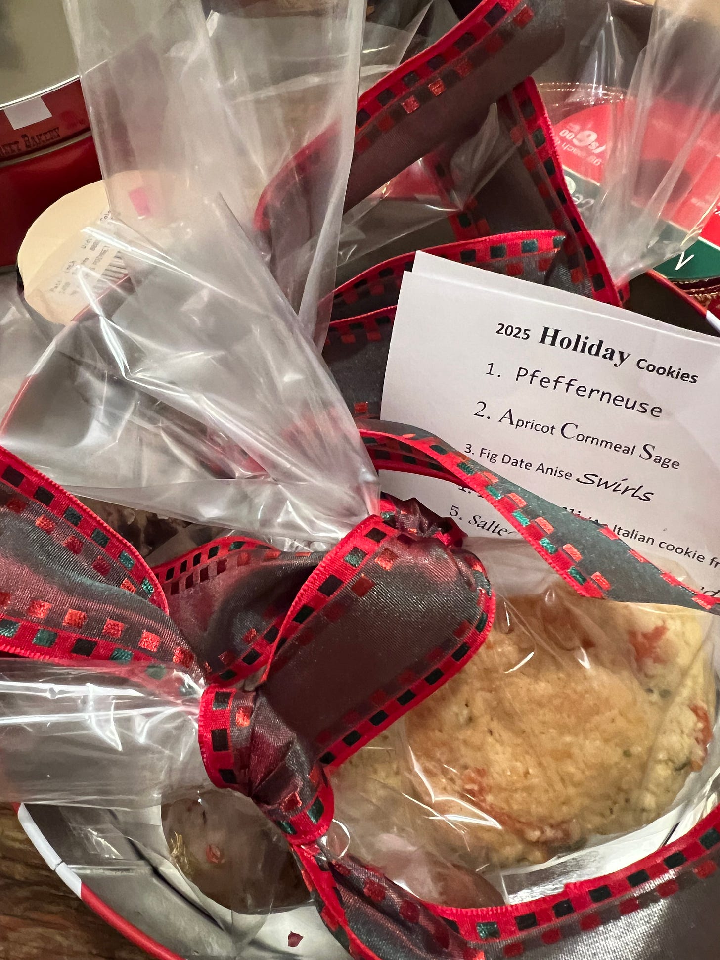 I have an annual tradition of exhausting myself producing a rather spectacular (at least in my own opinion) assortment of favorite cookies: the ones I most like to eat and the ones my friends report that they like best. I pack them artfully in cellophane bags, which I tie with gaudy and preferably glittery ribbons, salvaged from multiple forays into multiple thrift-store holiday sales. I arrange them in adorable holiday themed tins, accumulated during those same forays. Then I deliver them to nearby friends and ship to loved ones far away. I manage to do this with a determination, fervor and physical stamina that I don’t quite understand.
