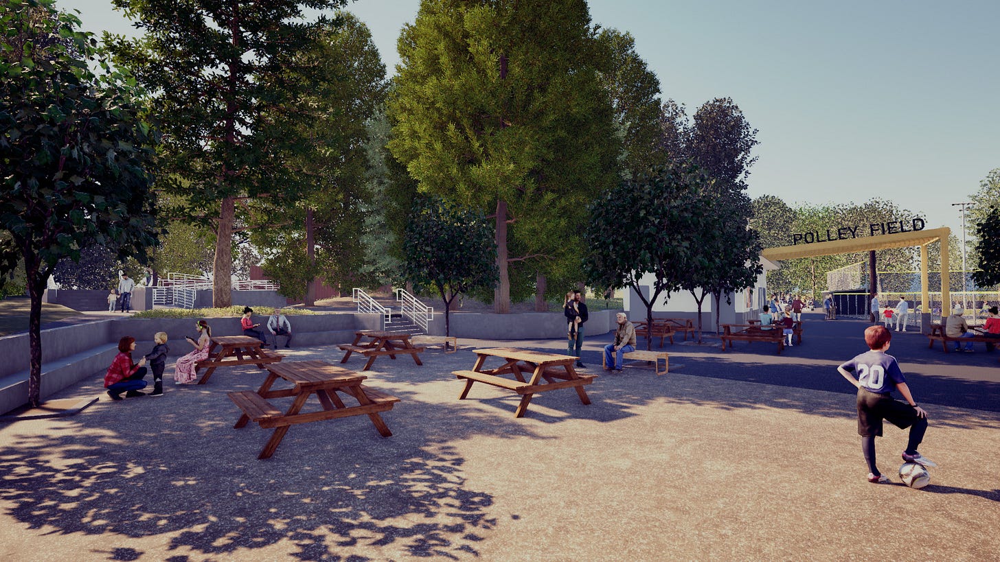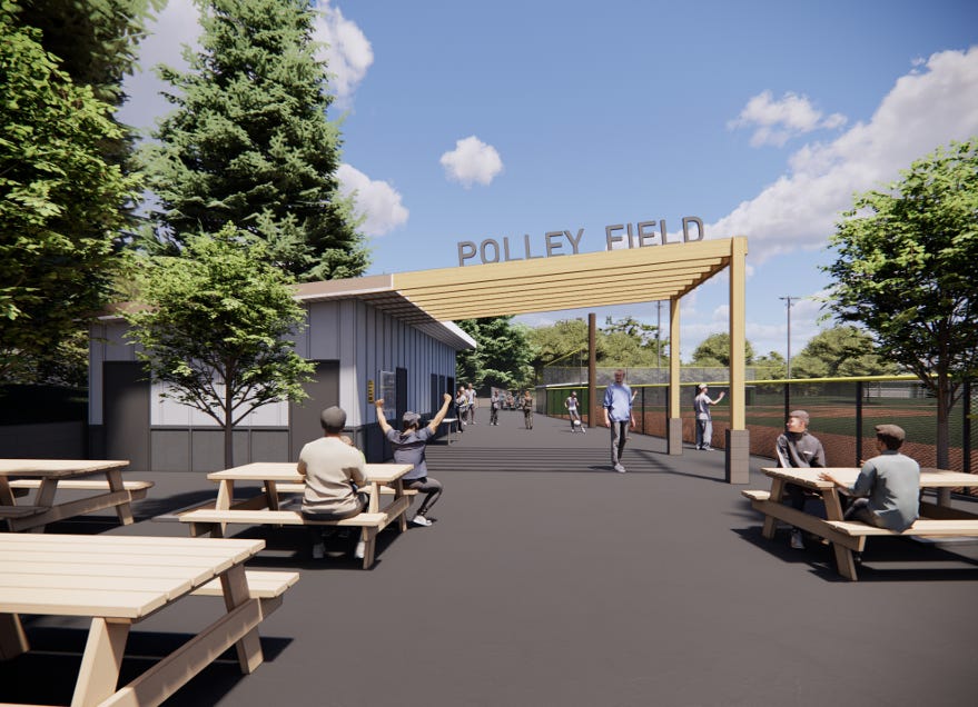 Polley Field Concession Stand & Restrooms: The existing concession stand structure will be removed and replaced with an upgraded facility constructed of durable materials. The new building would contain the concession sales space with views of the ball field, storage, and new ADA accessible restrooms. The space around the new building would contain tables and benches for use not only by players/parents when the field is in use, but also the general public during other events.