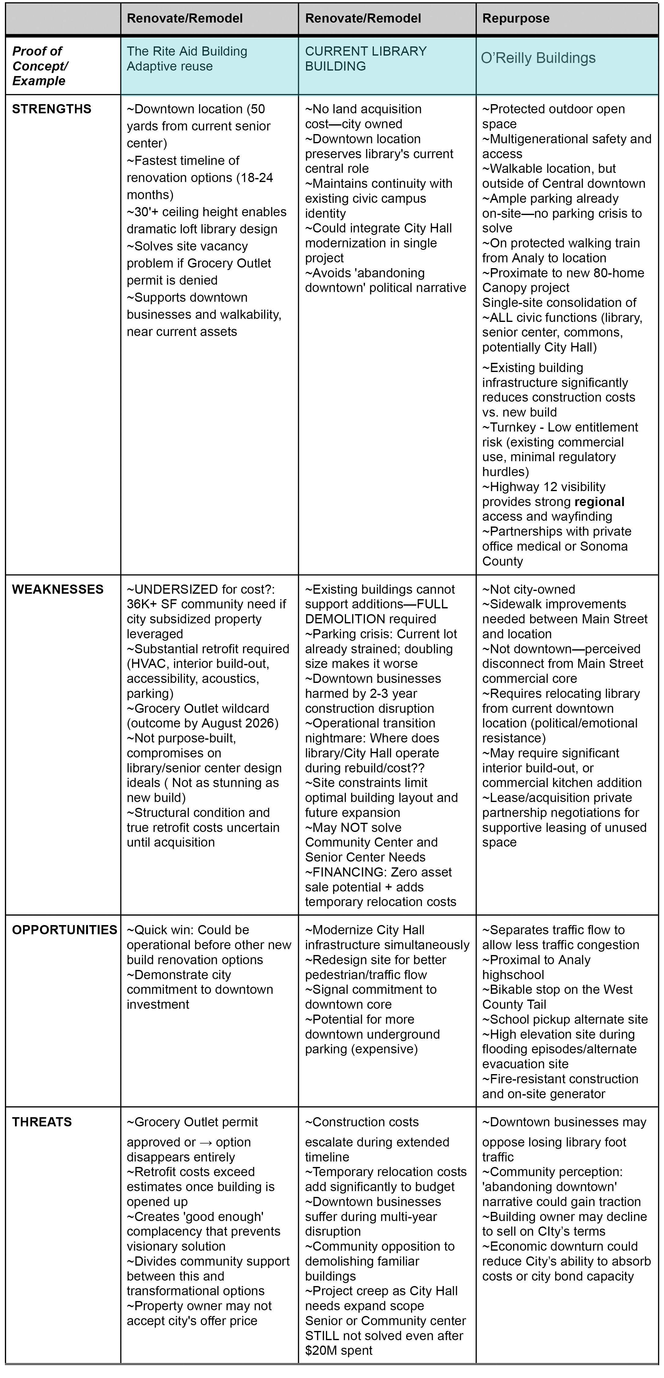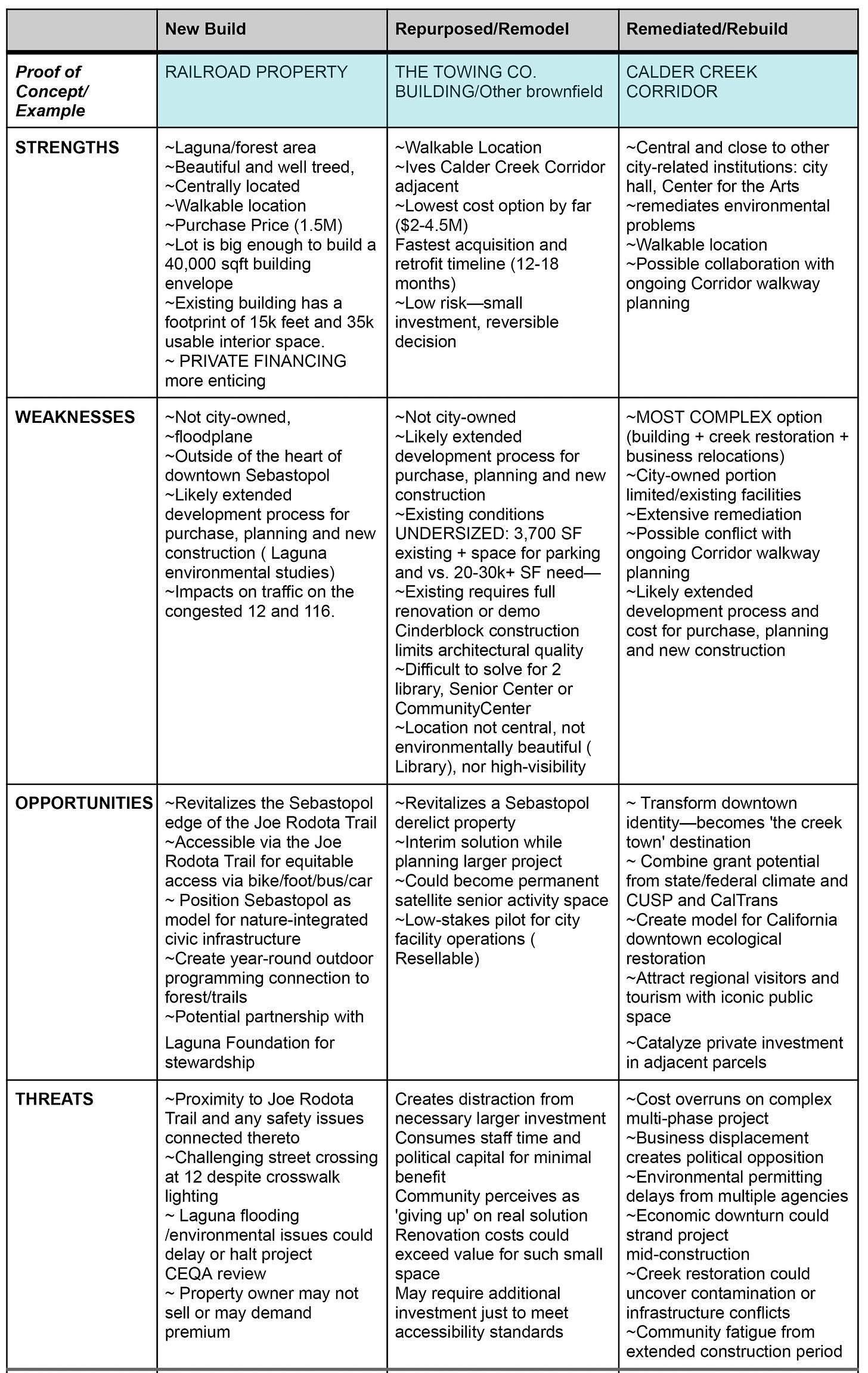 Much more exciting, however, was the Funding subcommittee’s SWOT analysis of six potential sites. (SWOT stands for strengths, weaknesses, opportunities, and threats.)