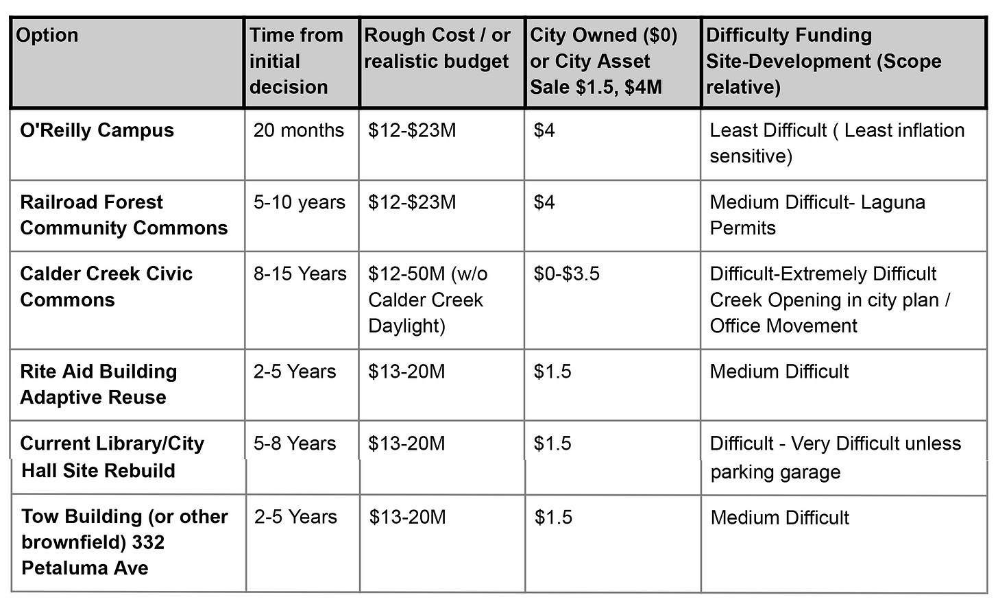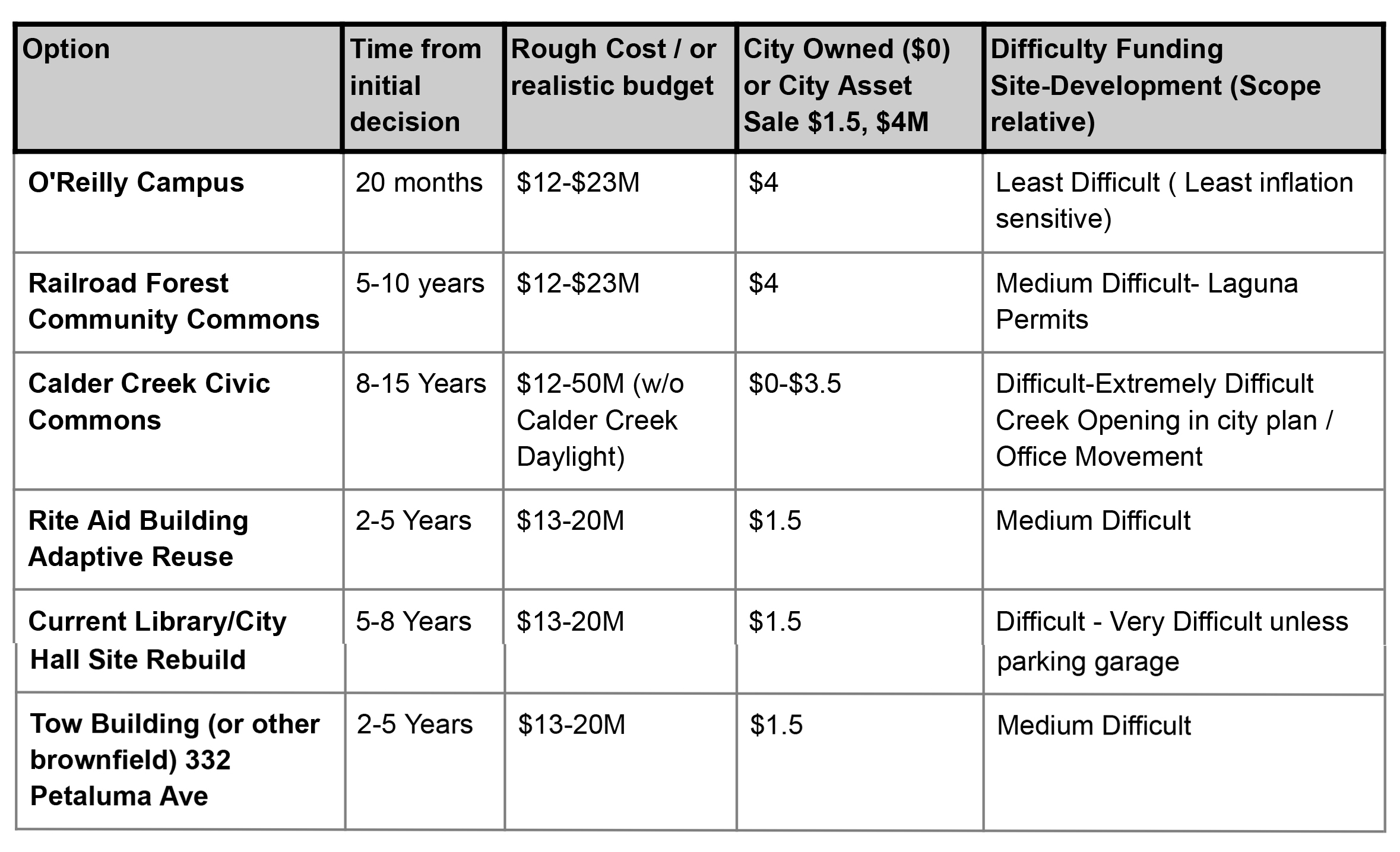 The Funding subcommittee’s report also included a rough comparison of development times and costs, as well as the potential for how much money might be raised by leveraging other city-owned properties. The former O’Reilly campus, which has been underutilized for years, ever since O’Reilly Media moved out, seems like a clear winner here. Committee members caution that nothing is set in stone, however.