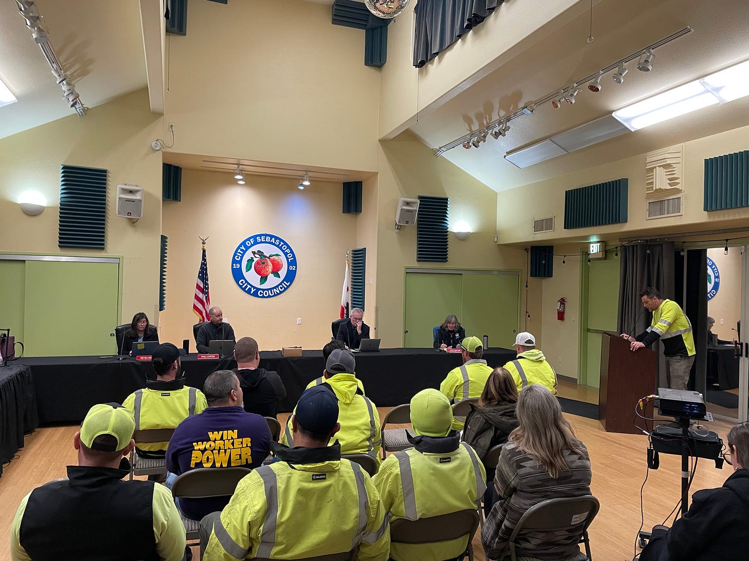 Public Works employees, in their fluorescent yellow vests, showed up for public comment. Their union is currently in negotiations with the city for a new contract. Speakers highlighted the need for “non-competitive advancement for our employees” which one speaker said “would create a clear, predictable path for career growth based on experience, demonstrated competency and time of service.” (Non-competitive advancement is promotion from within the organization without having to advertise the position publicly.)