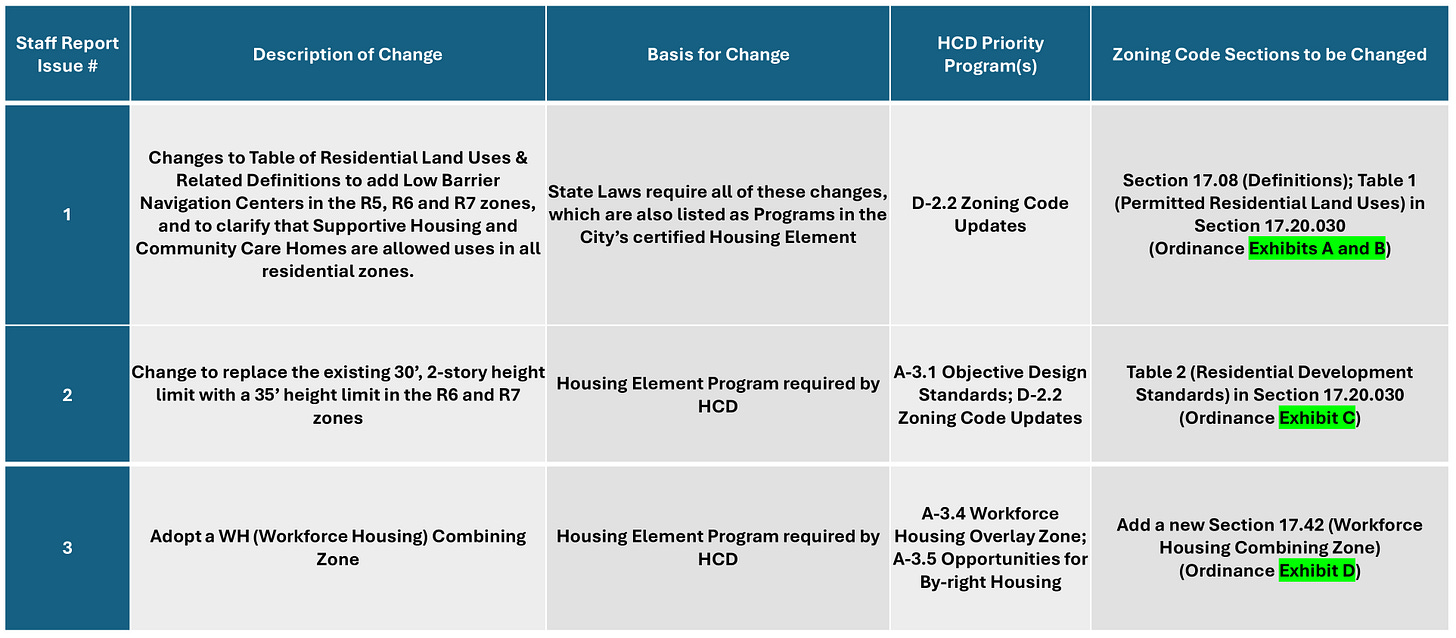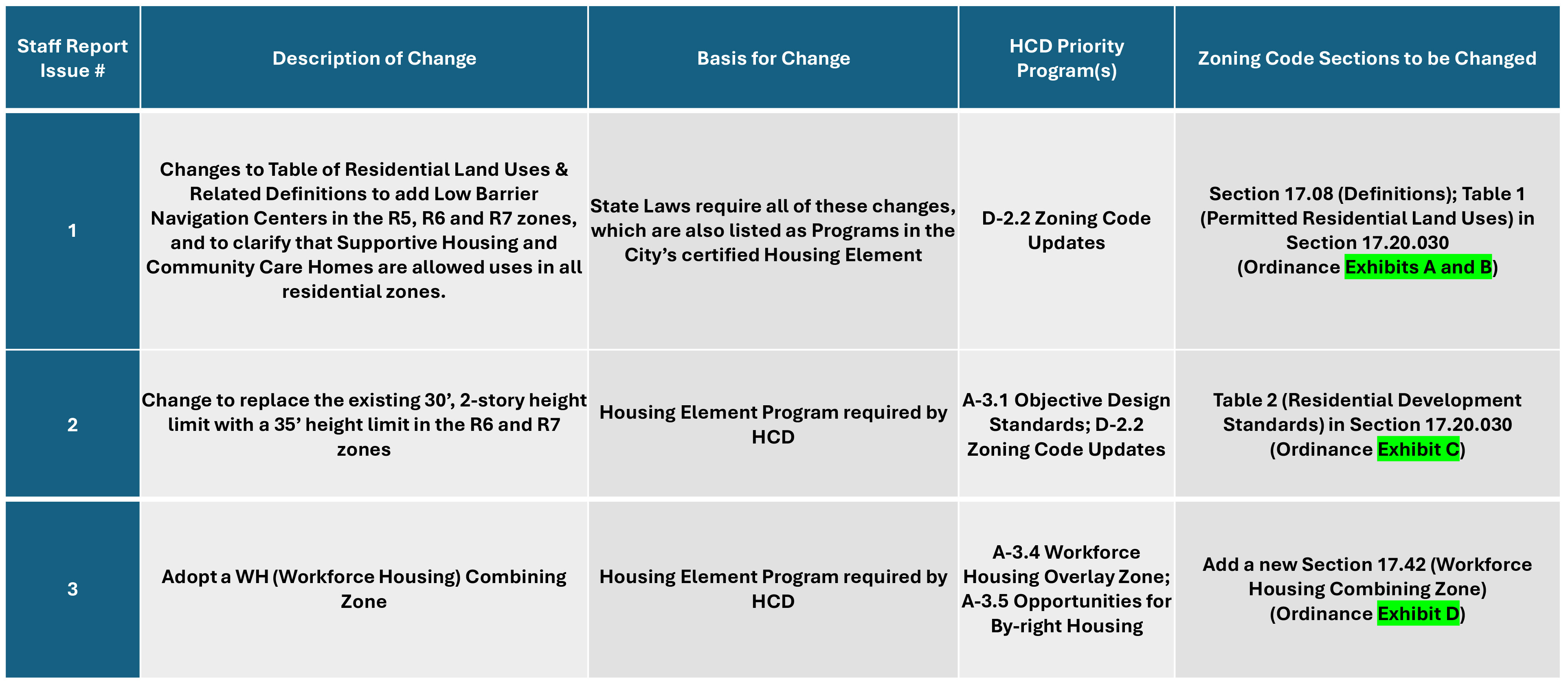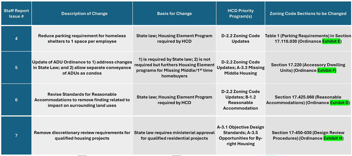 The council approved the zoning changes listed below, most of which were required by state law or to comply with California Housing and Community Development (HCD) requests regarding updates to the Housing Element of Sebastopol’s General Plan.