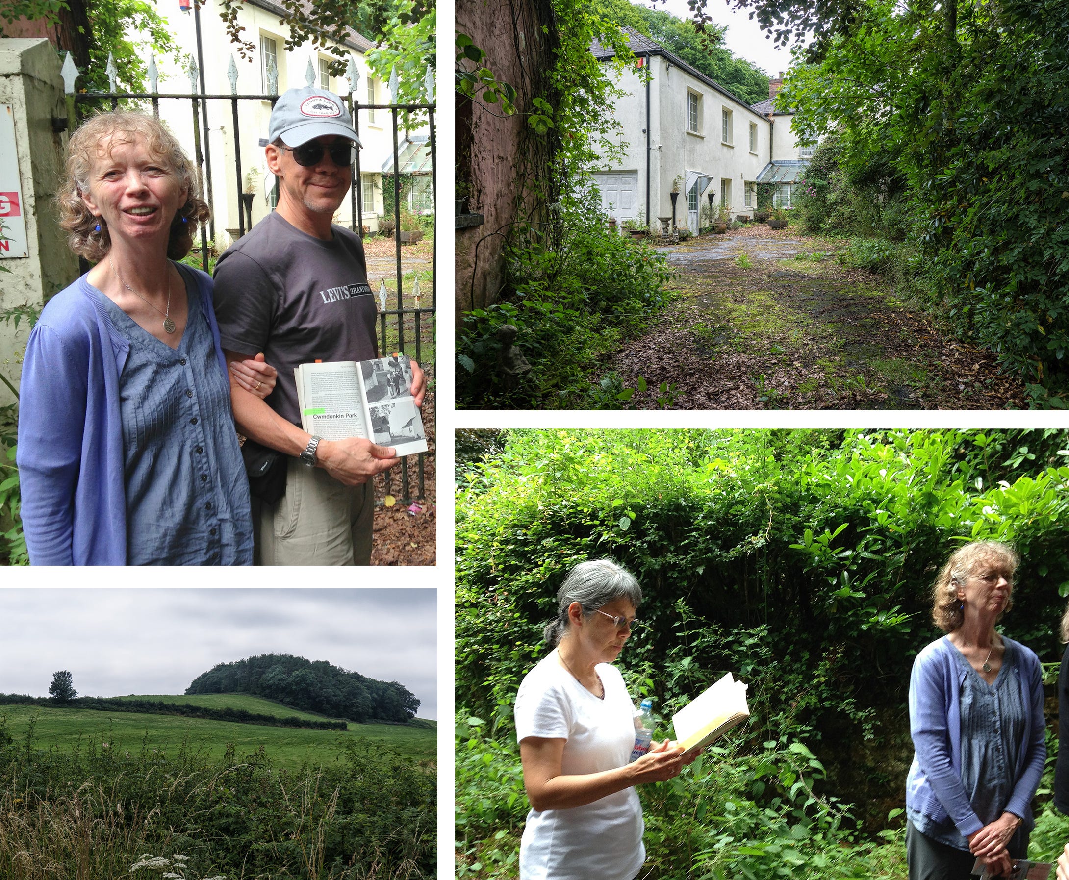 On one particular afternoon, we were driving the hills of Carmarthenshire, searching for Fern Hill, the family farm of Dylan Thomas’s Aunt Annie and Uncle Jim, which the poet immortalized in his poem by that name. Our group of writer-travelers stood outside the gates of the old farmhouse at the foot of Fern Hill, while Phyllis led us in taking turns reading stanzas of Thomas’s ode to childhood. The photos below, taken by Jerry Meshulam, are of Fern Hill and the farmhouse, the reading at the gate, and Jerry and Phyllis with the guidebook that led us there.