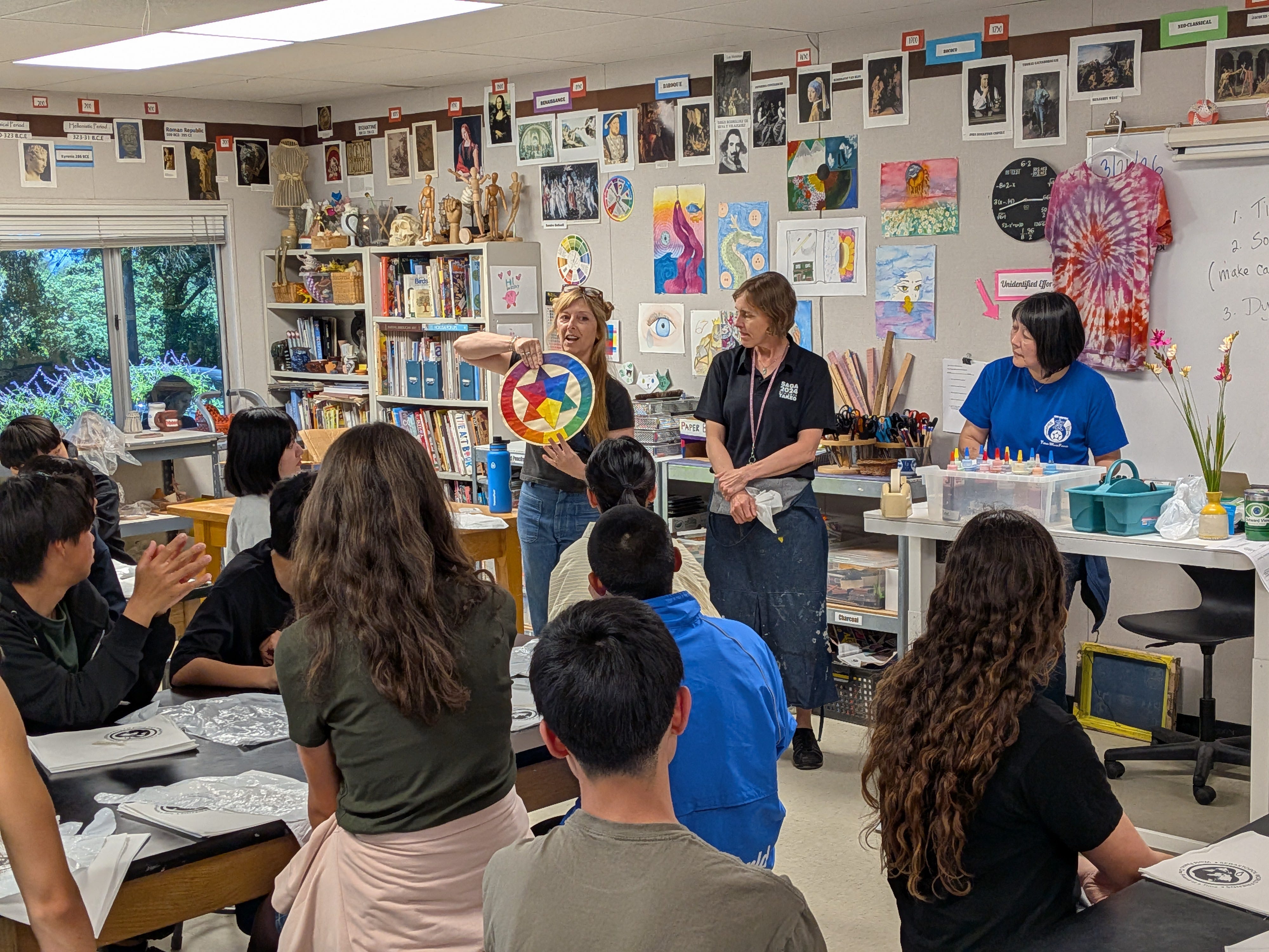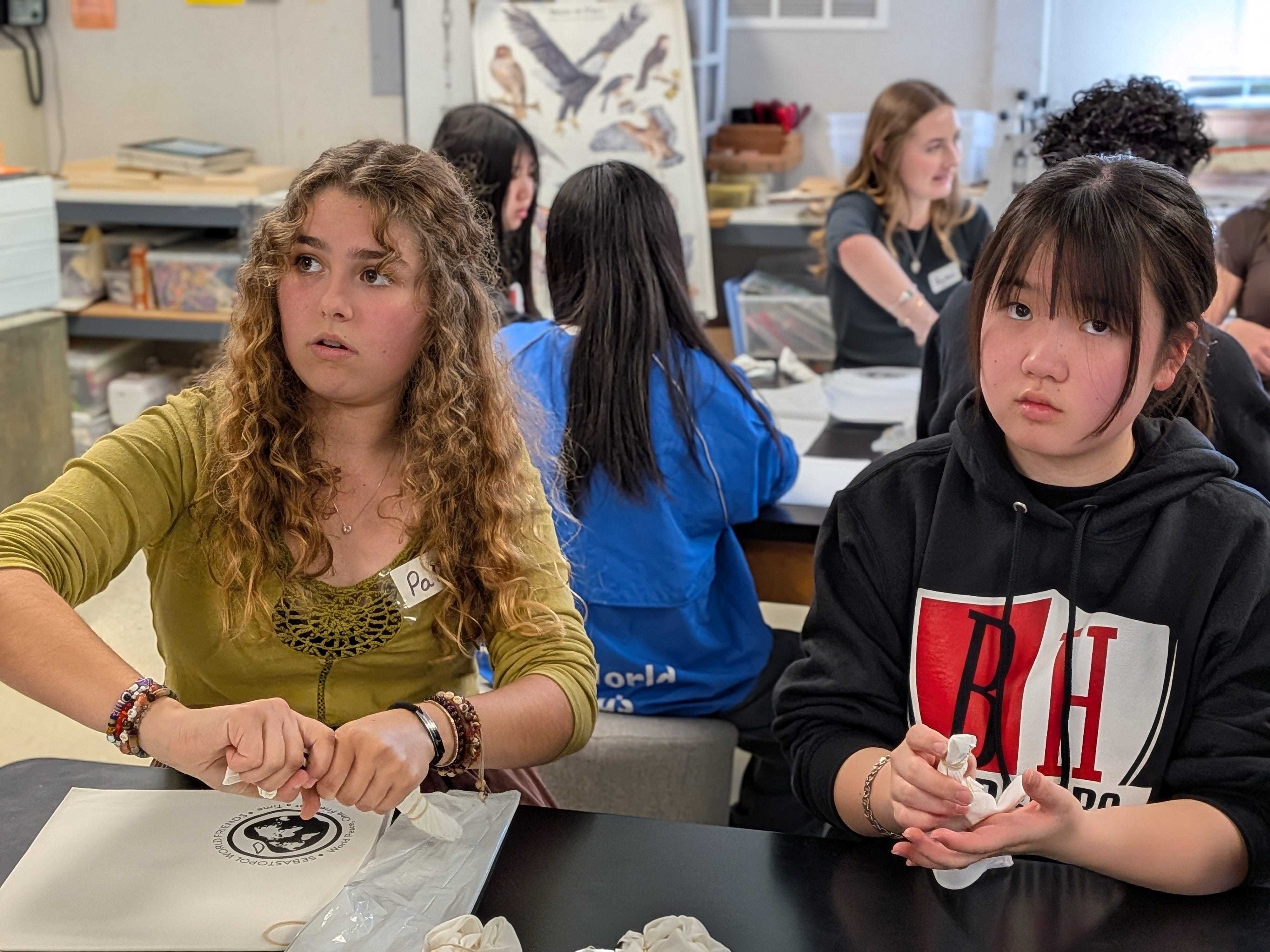 Today the Sister City Student Delegation from Takeo City, Japan, visited Orchard View School to do a cultural art program led by Nell Hergenrather and Sunny Galbraith. Takeo students are here this week to celebrate the 40th anniversary of our relationship between Sebastopol and Takeo City. Activities have included homestay days, Armstrong Woods, Bodega Bay, school shadow visits, San Francisco, and the Charles Shultz Museum and ice rink in Santa Rosa. Takeo students worked with the Global Studies class at Orchard View School to tie-dye bandanas for themselves and their families back home.