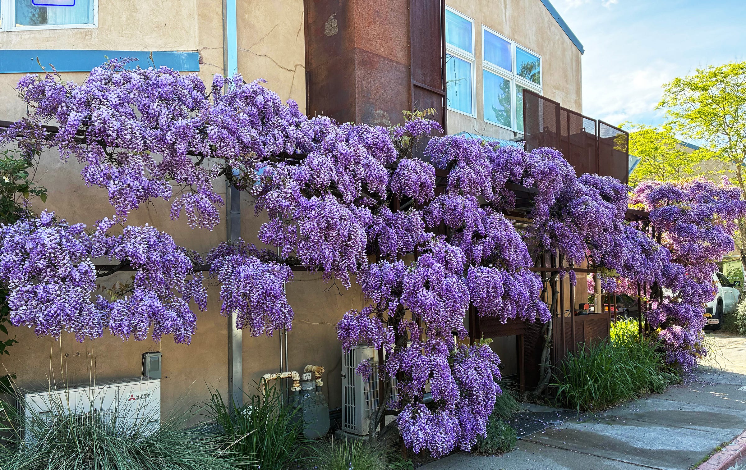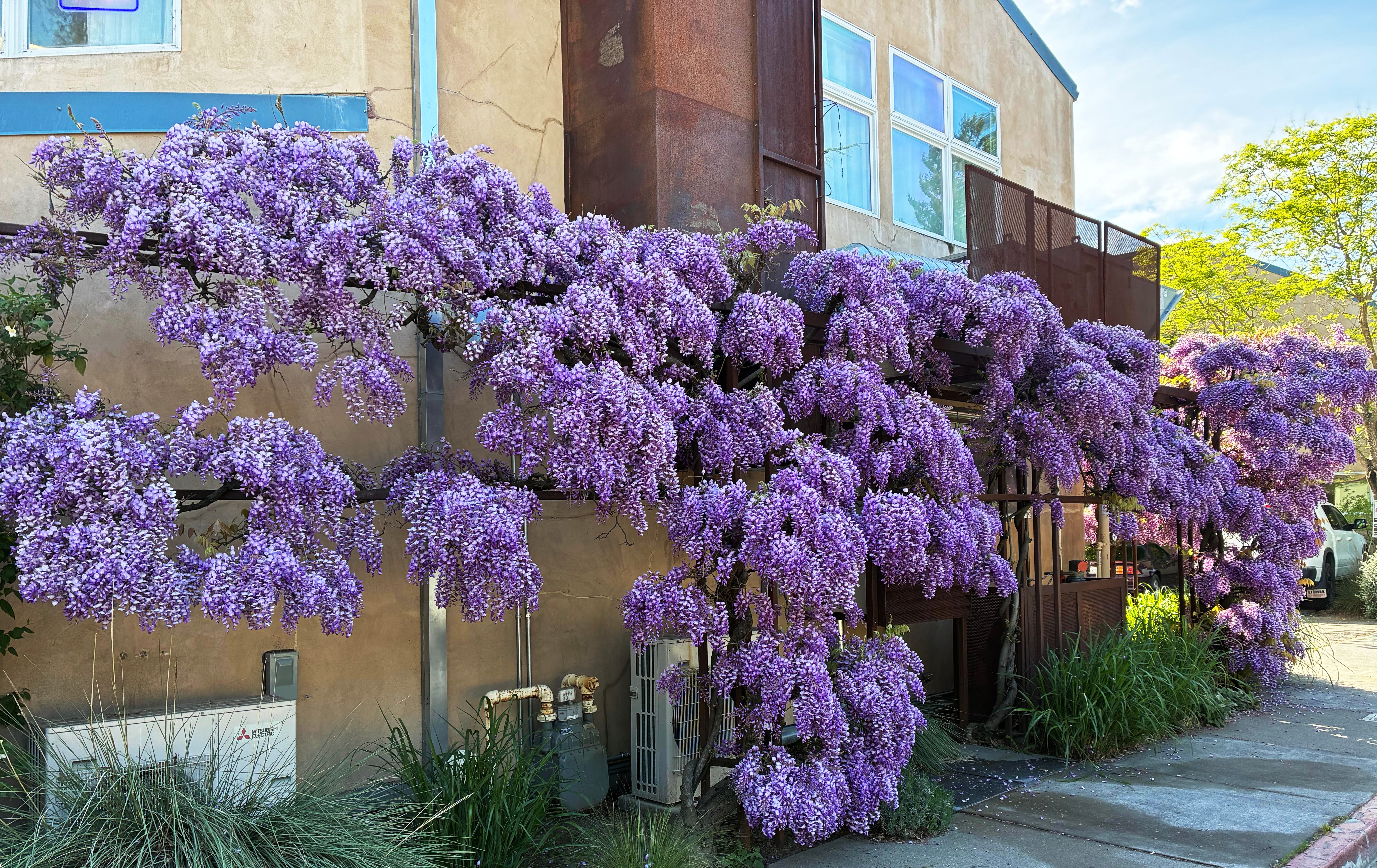 Wisteria is exploding all over town this week, and one of the finest examples is this beauty on the Thai restaurant Khom Loi at the corner of Healdsburg and Florence avenues.
