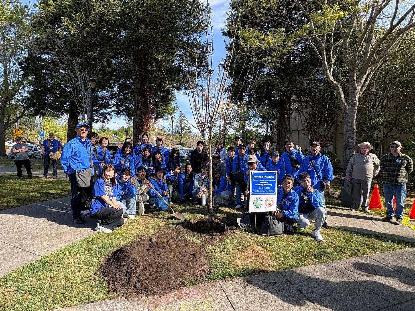 Japanese students were in Sebastopol this week celebrating 40 years of friendship between the two cities, fostered by Sebastopol World Friends. They planted a cherry tree in Sebastopol’s downtown plaza (above) and visited Armstrong Woods. They also visited Orchard View School to make tie-dye bandanas—so Sebastopol!