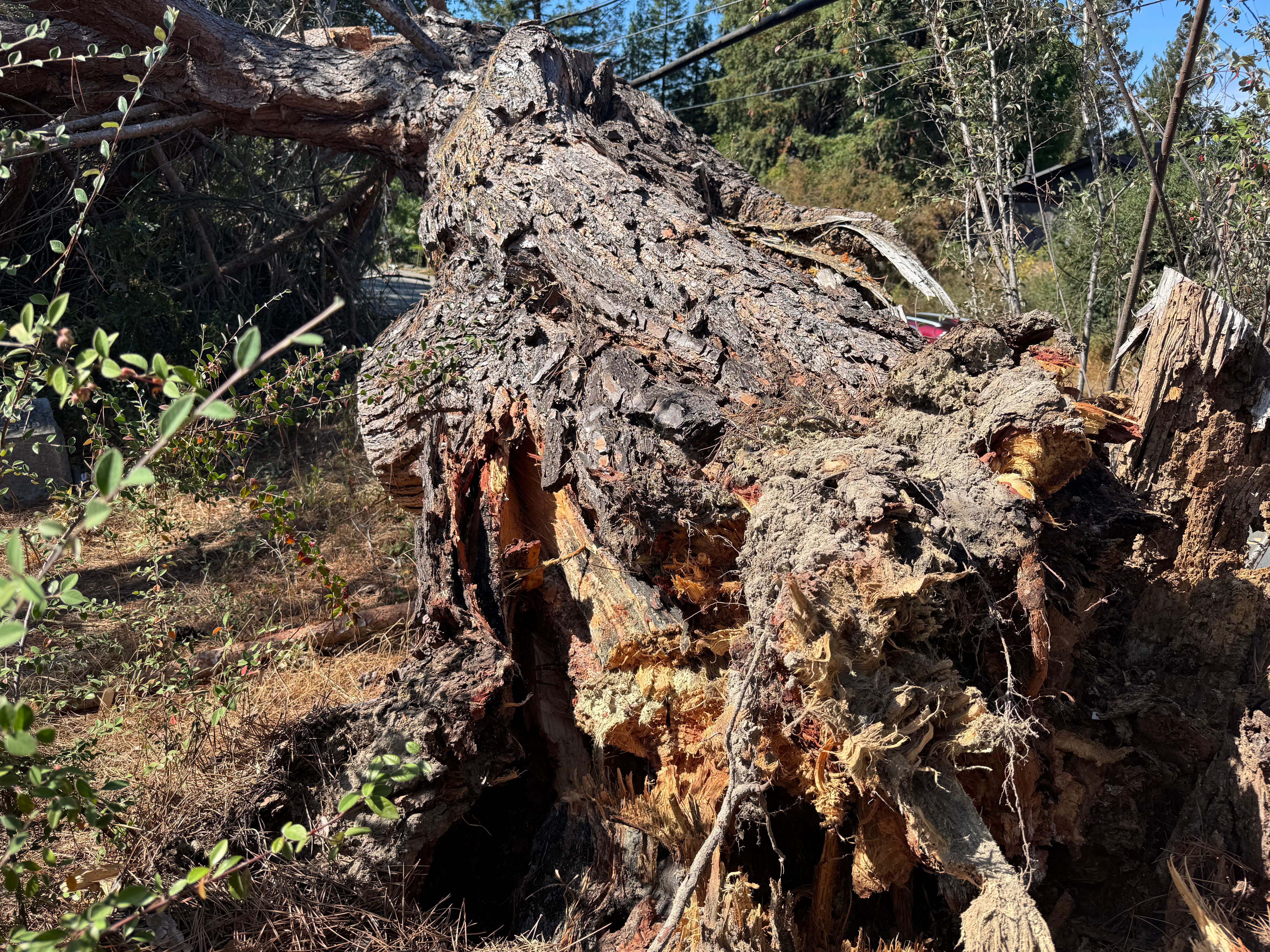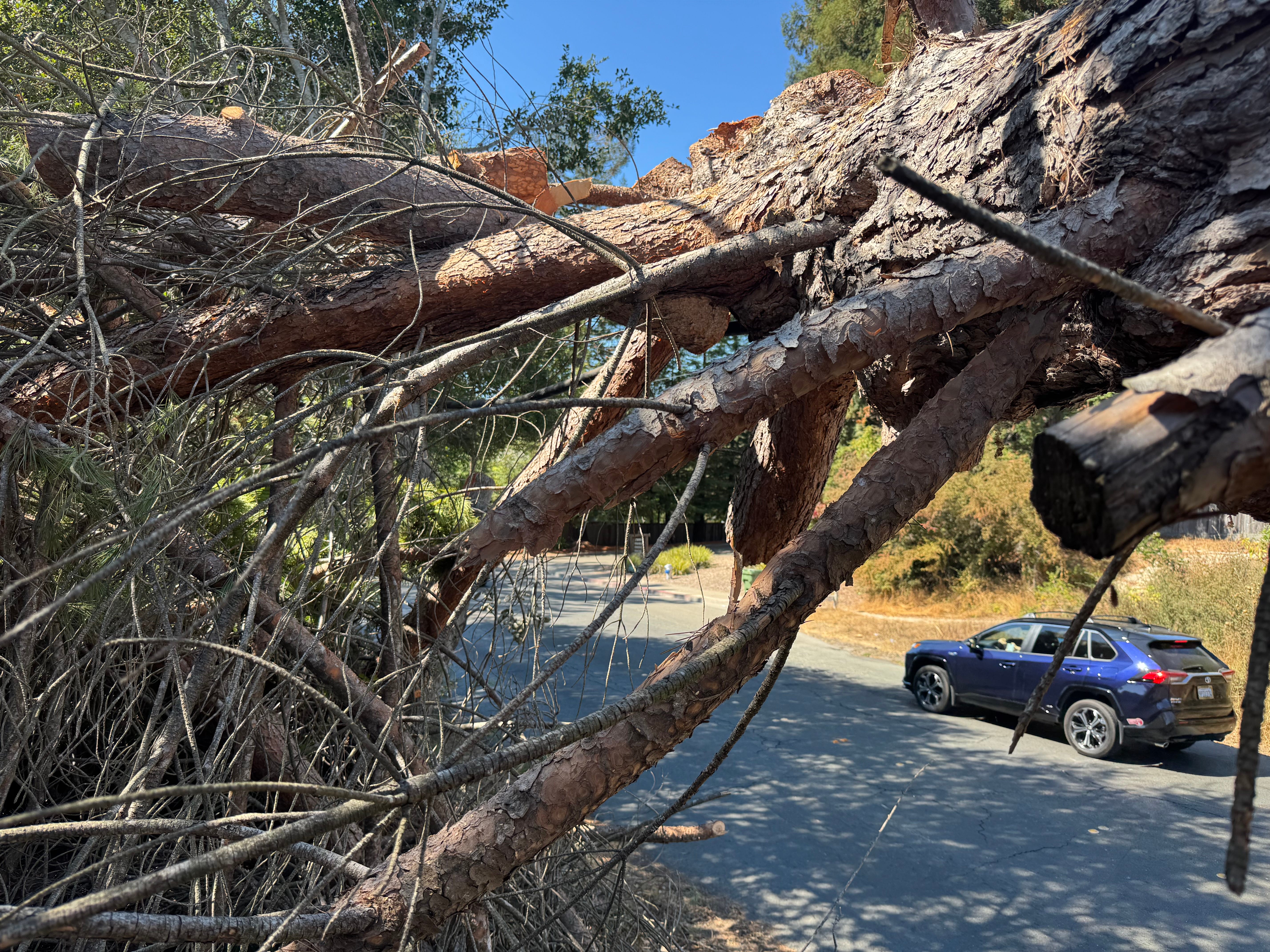 On Saturday, Sept. 13, a large pine tree at the northwest corner of the Sebastopol Memorial Lawn cemetery fell over on to Bodega Hwy. Both lanes of the road were closed past 10 am in the morning as crews cut up the portion of the tree on the highway. The rest of the fallen tree remains on the edge of the cemetery, near the road quite close to power lines.