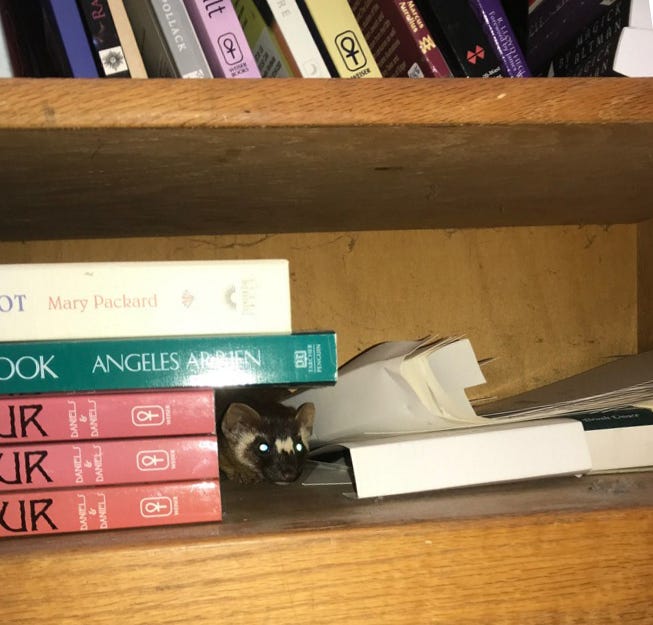 The wild creature inside Many Rivers Books and Tea was the talk of Retrograde patrons next door. A weasel had found a way into the store, probably through the front door, and then was scurrying around bookshelves and counters for a few days. The customers at Retrograde were asking "did they get a ferret at Many Rivers?"