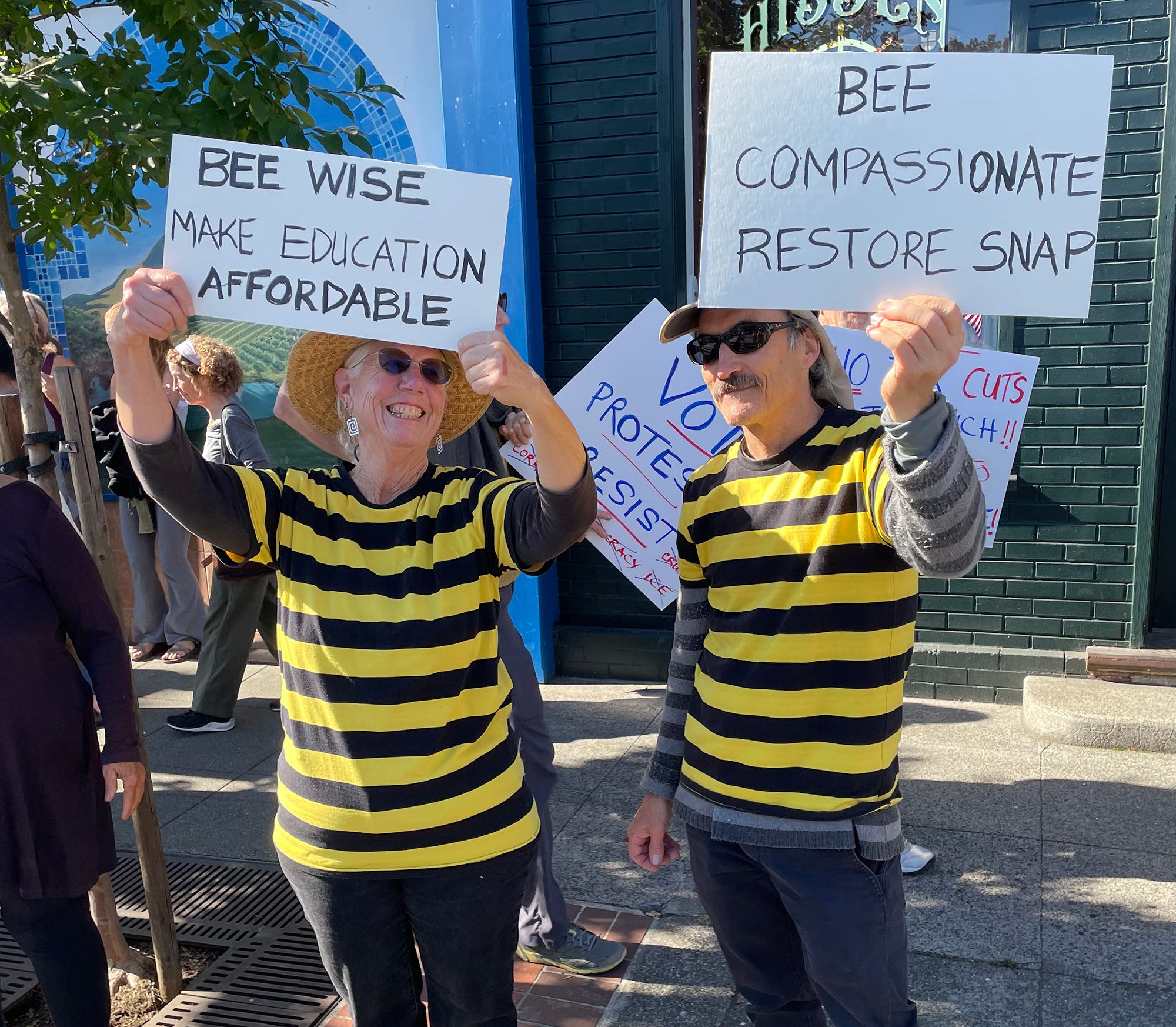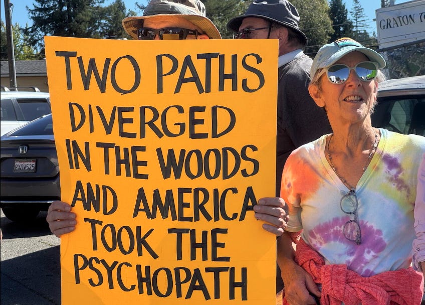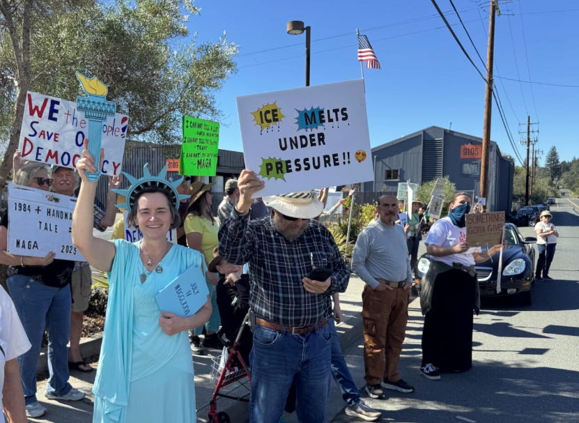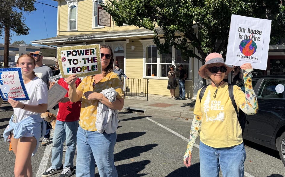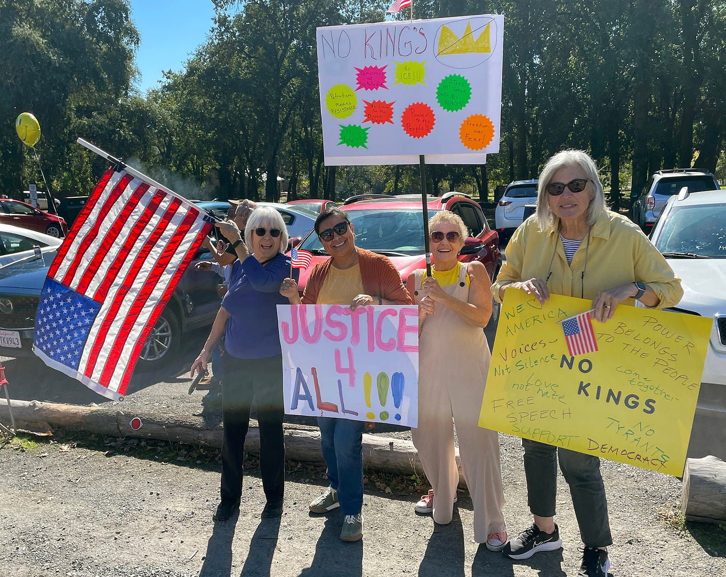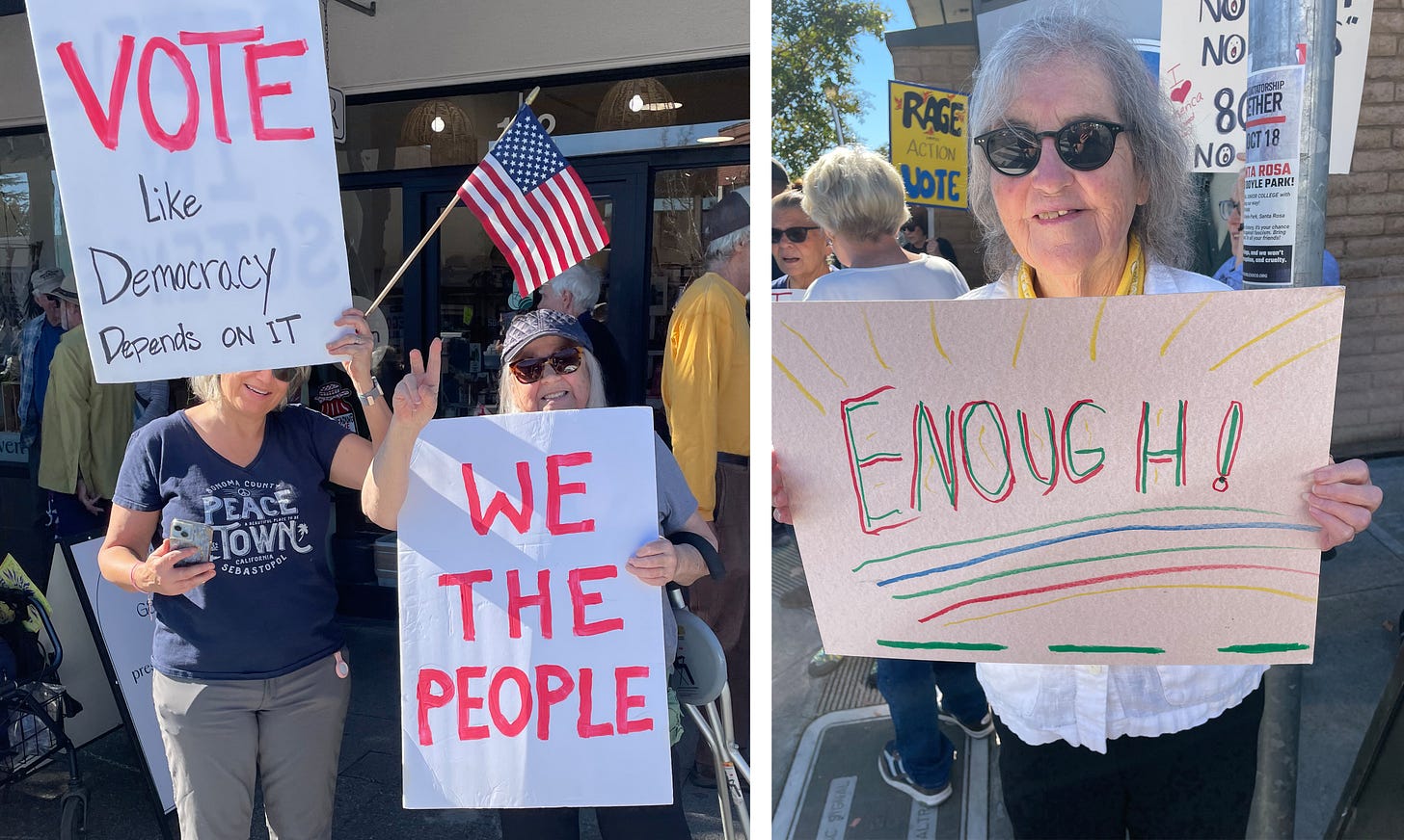 Roughly 1,100 people showed up for the No Kings protest in downtown Sebastopol on Saturday, Oct. 18. (Thanks to Robert Uleman for the count!) This protest was part of the national “No Kings: National Day of Defiance.” Here are a few pics from the day: