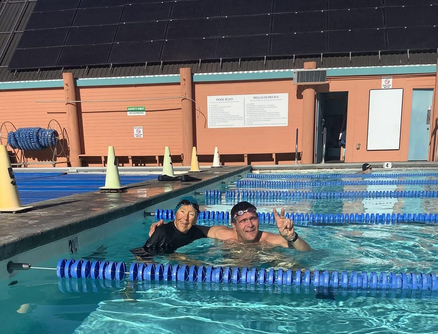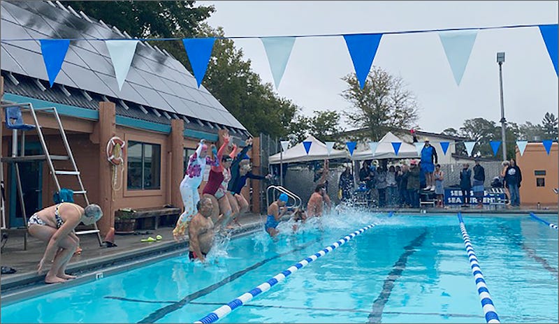 “On Monday, Oct. 13, there was a ceremony for 94-year-old swimmer Jennifer Nichols. She had used the pool for many years, despite suffering from severe arthritis. She was always there, and I had many conversations with her about the news of the day when I came to swim laps at Ives. She had a bright wit and never complained about a condition that caused some bodily deformity. She even wrote a poem about it, saying, ‘I have outlived my twisted spine.’ She was British and quite proper, but she also had that same British sense of humor. She even wrote her own epitaph, and in a Twilight Zone moment had a letter to the Press Democrat published the day after she died. As you can see by the photos, quite a few folks came out on a rainy day—although the rain stopped for the memorial—and then everyone took the Jenny Jump into Ives Pool.”