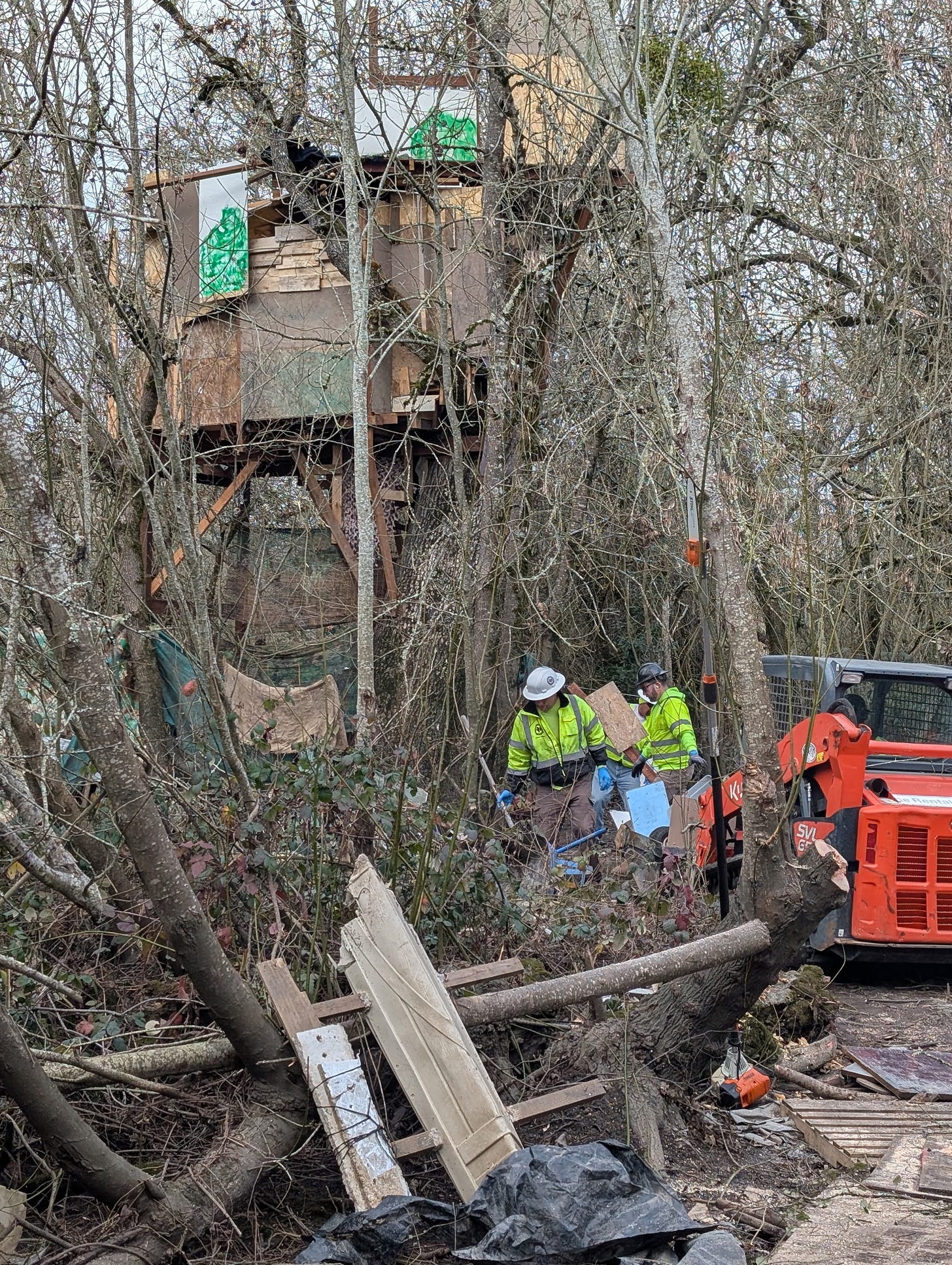 This week, a crew from Sebastopol Public Works dismantled a large tree fort that was part of a homeless encampment located in the Laguna north of the Joe Rodota Trail. Bill Howley alerted us to the demolition of a “fairly impressive, semi-permanent. unpermitted structure” and noticed that dedicated city workers were “continuing to dismantle and carry away the remnants, trash, and assorted detritus.”
