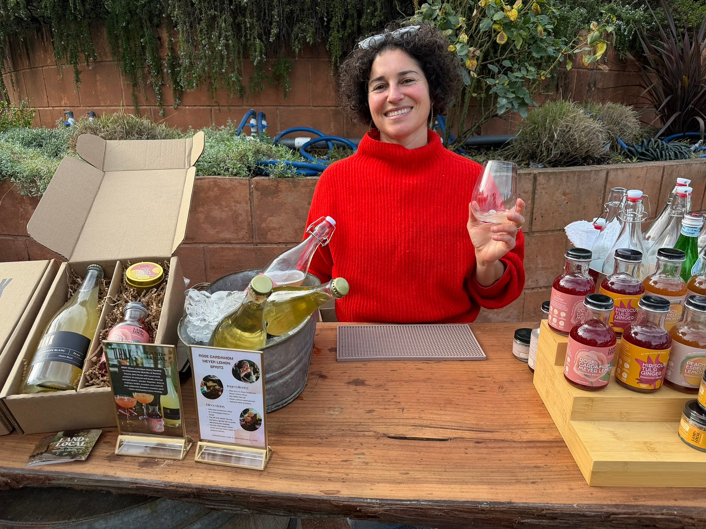 Kim lives in Healdsburg after living in Sebastopol for four years. She is a chef and herbalist. During Covid, Kim needed to find a new way to make a living. “I couldn’t go into people’s homes and cook for them anymore.” She came up with the idea of herbal-based mixers sourced from the produce of Sonoma County farms. “I wanted to find ways to incorporate herbal medicine into people’s daily lives and I decided to use natural, local ingredients to make drinks.” Now she makes her products by hand in Healdsburg and sells them at farmers markets in the area and online. She can often be found at the Sebastopol Farmers Market.