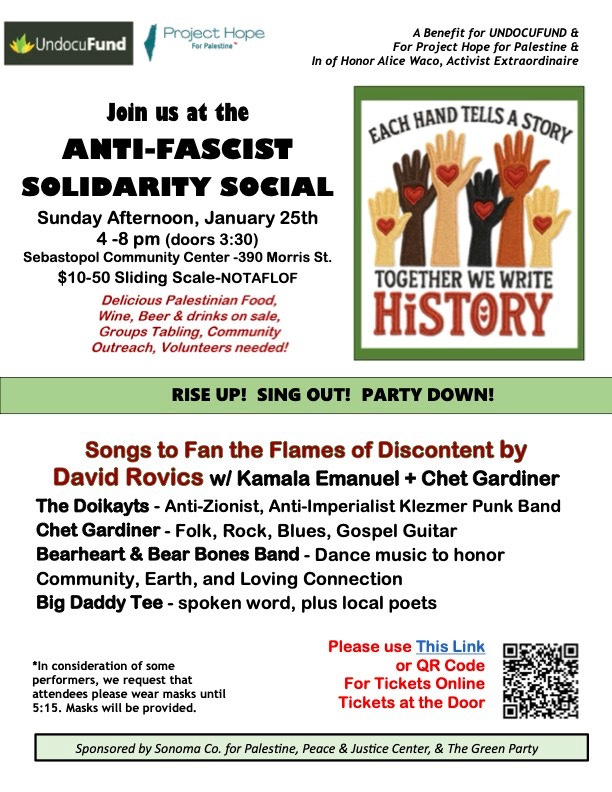 Today, Sunday, Jan. 25, at the Sebastopol Community and Cultural Center, there will be a solidarity social from 4 pm to 8 pm. Sebastopol Times reader Robin Latham tells us that the social was organized by activists from different organizations, including the Peace & Justice Center of Sonoma County, the Green Party and Sonoma County for Palestine. The headliner is David Rovics, a folk troubadour. There will be three bands, along with poetry reading. “The purpose of the event is for activists and concerned people to come together and have a social moment that isn’t about being on the streets and protesting,” she said. “We’ve been doing that every day, and we need to be with our allies to celebrate and support each other during these hard times.” According to the poster, funds raised at this event will go to Undocufund and Project Hope for Palestine.