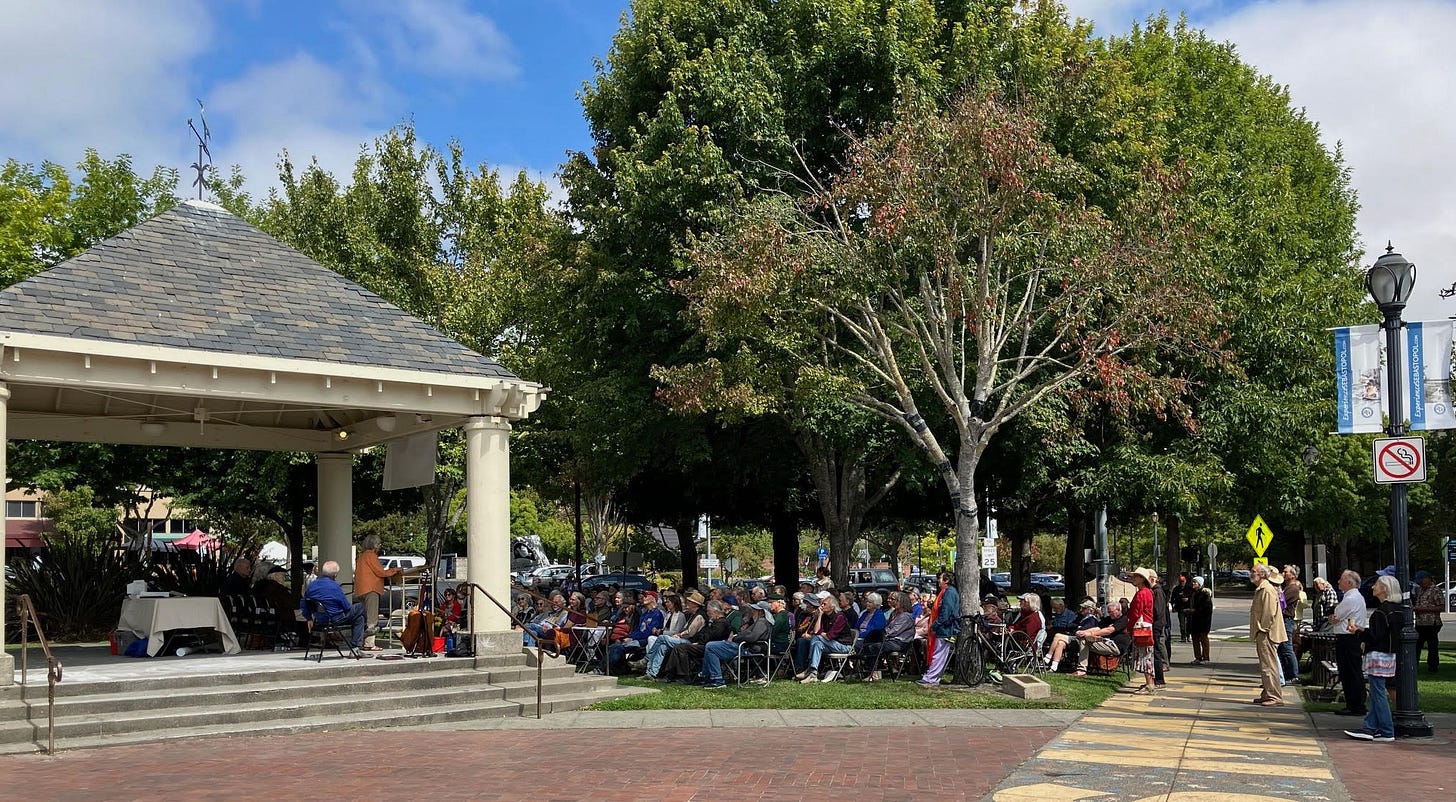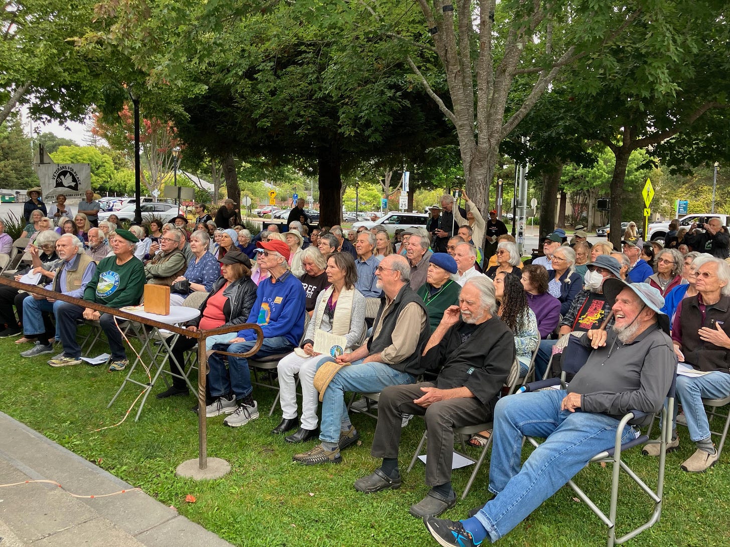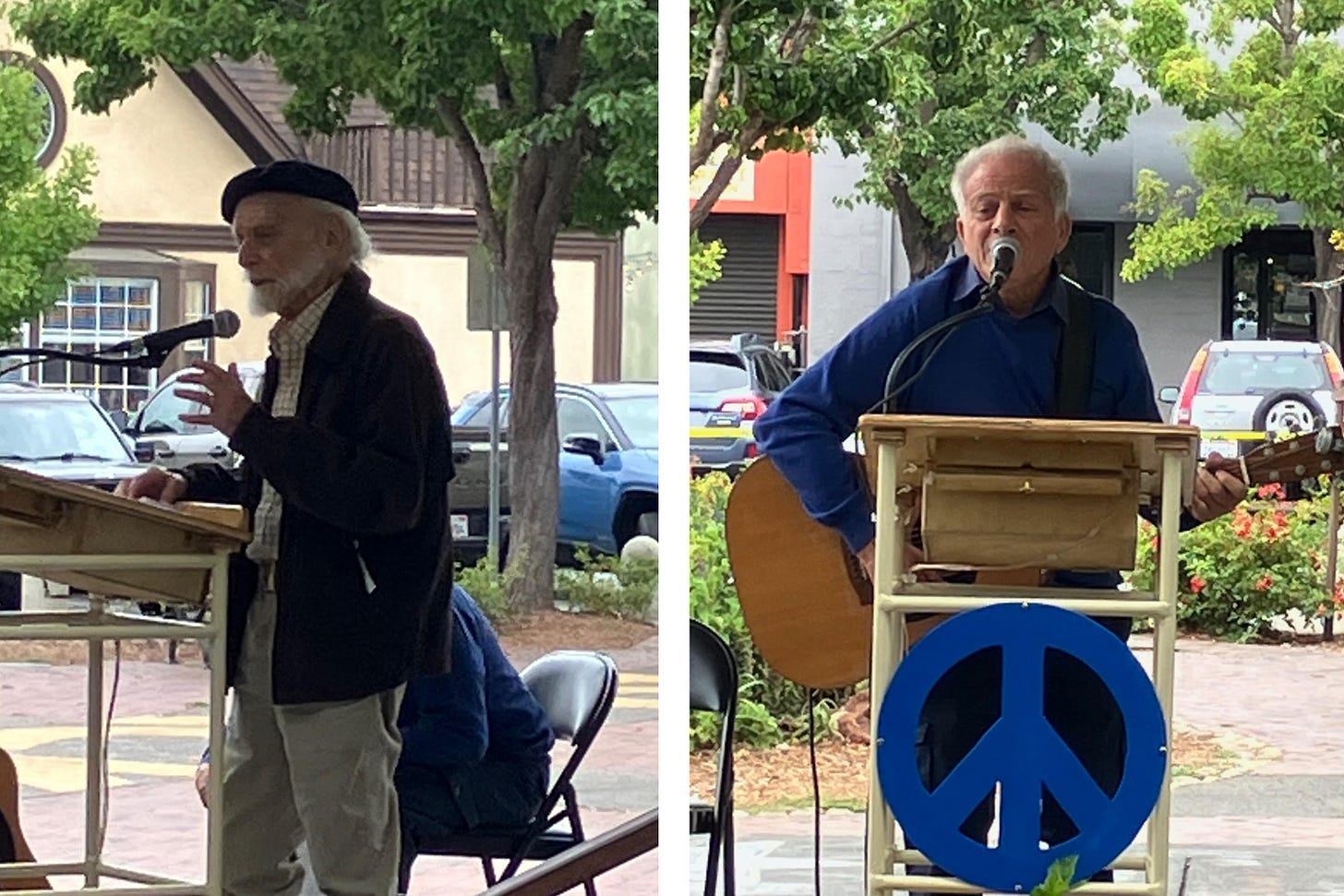 On Saturday at the plaza, the ceremony for the Peace Wall was held. As described in Rollie’s preview article, four new honorees were added: Alice Waco, a co-founder of Sonoma County’s Peace and Justice Center; David Hartsough, a Quaker who was engaged in nonviolent resistance against all U.S.-involved wars since Vietnam; Bob Alpern, a director of the Unitarian Universalist Association of Social Justice; and Gerry Condon, an active member of Veterans For Peace.