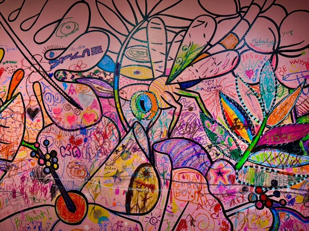 The “Art of Play” exhibition at SebArts ends today (September 7). (Laura wrote about it here.) The panel discussion took place in between two walls of the exhibit that featured the outline of a mural by Amanda Lynn on which anyone could color or draw. A lot of people accepted the invitation to add their own creative touch.
