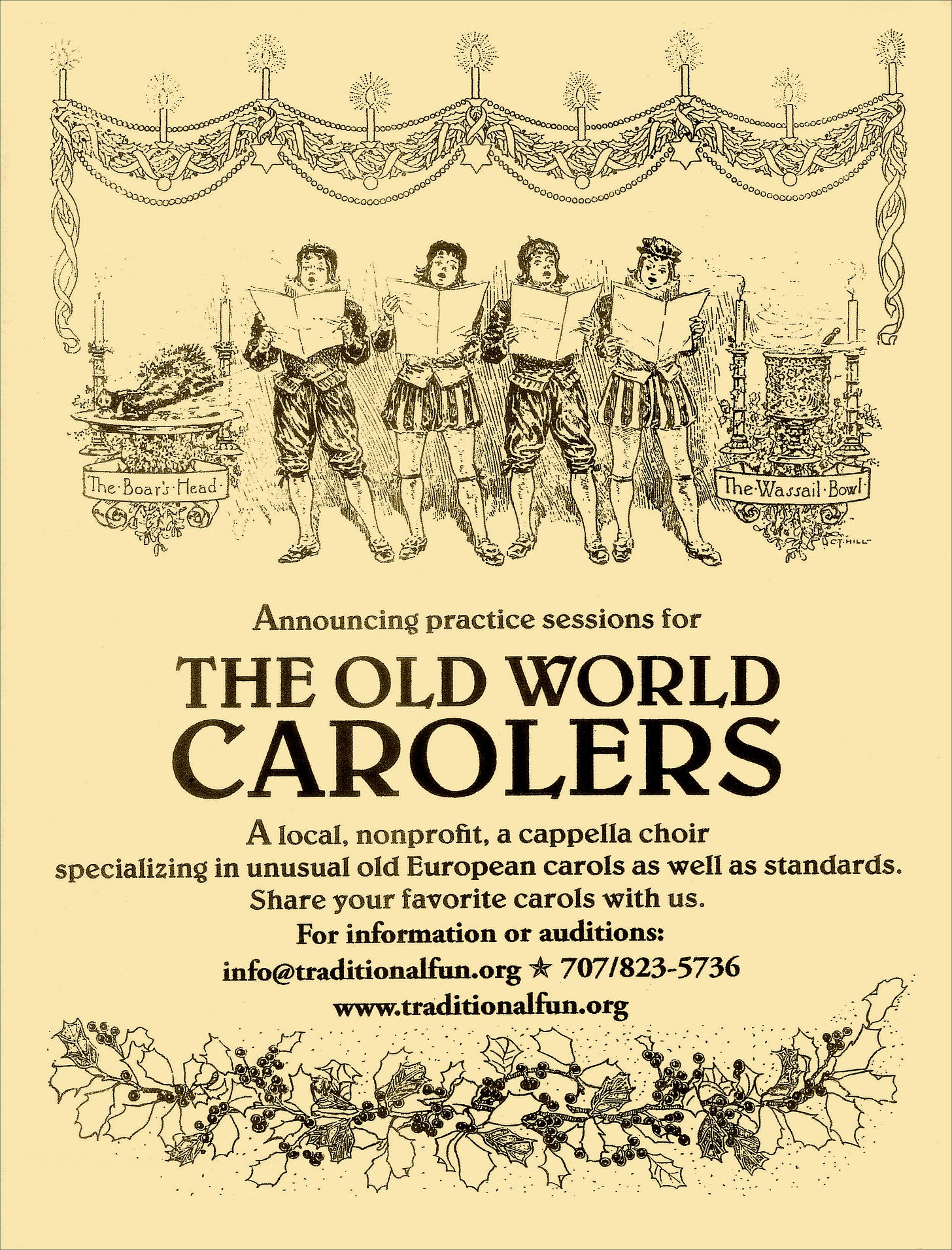 The Old World Carolers are once again putting out the call for local singers who’d like to participate in this fine old Sebastopol tradition. The Old World Carolers is celebrating its 40th anniversary this year. Auditions are going on now, and practice for this year’s performance season start on Thursday, August 21. For more information, contact Rebecca Dwan at info@traditionalfun.org. (See our article on the group from last year.)