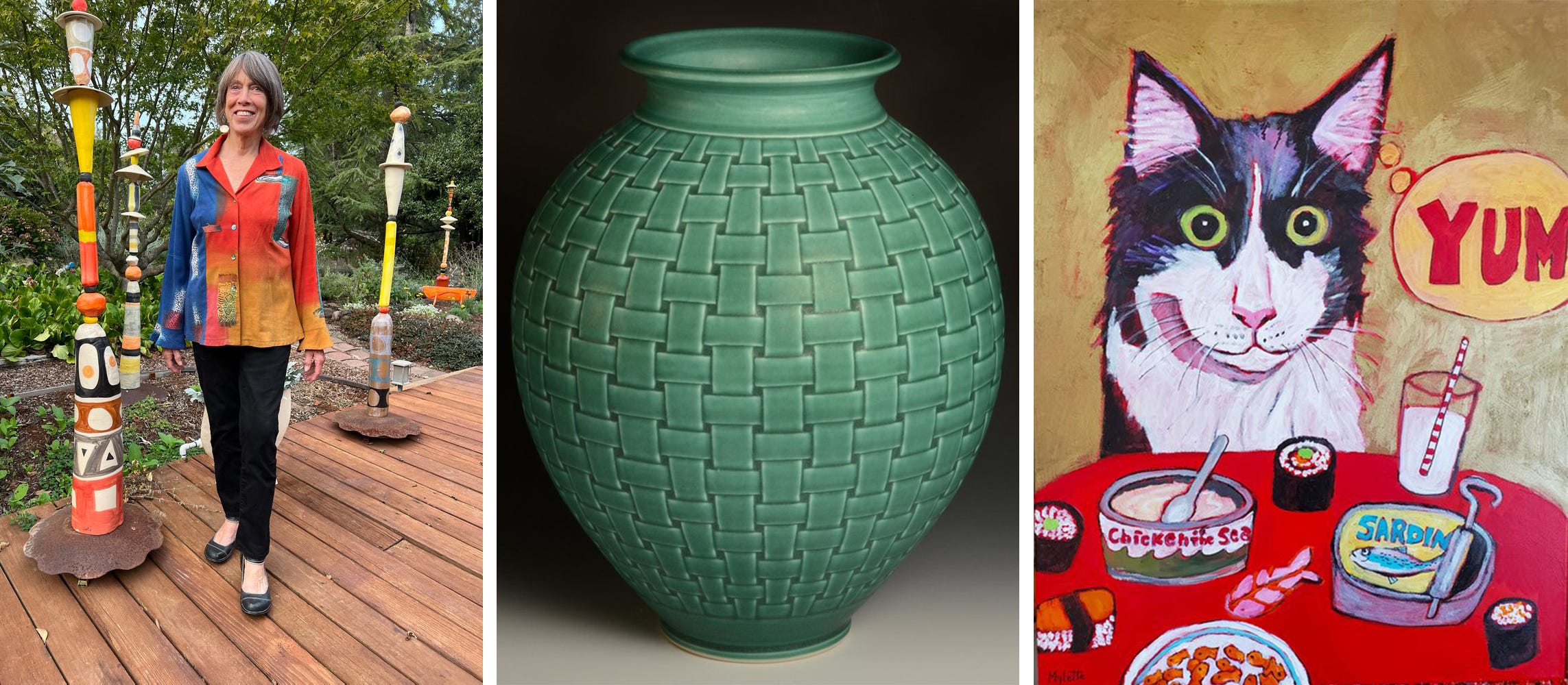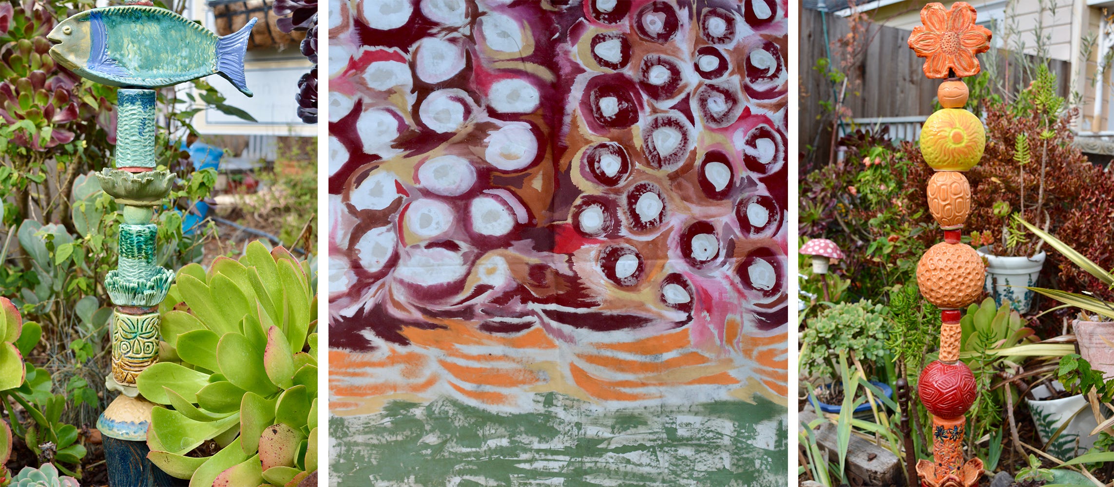 Artist Couple - Maura Palmer and Jeremy Calnan - Studio 71: Maura is a sculptural ceramicist making hand-built garden totems and Jeremy is an abstract painter who describes his work as "spontaneous and intuitive", they use the artist name "Joyful Monk Art" and are located on Petaluma Avenue in the heart of town.