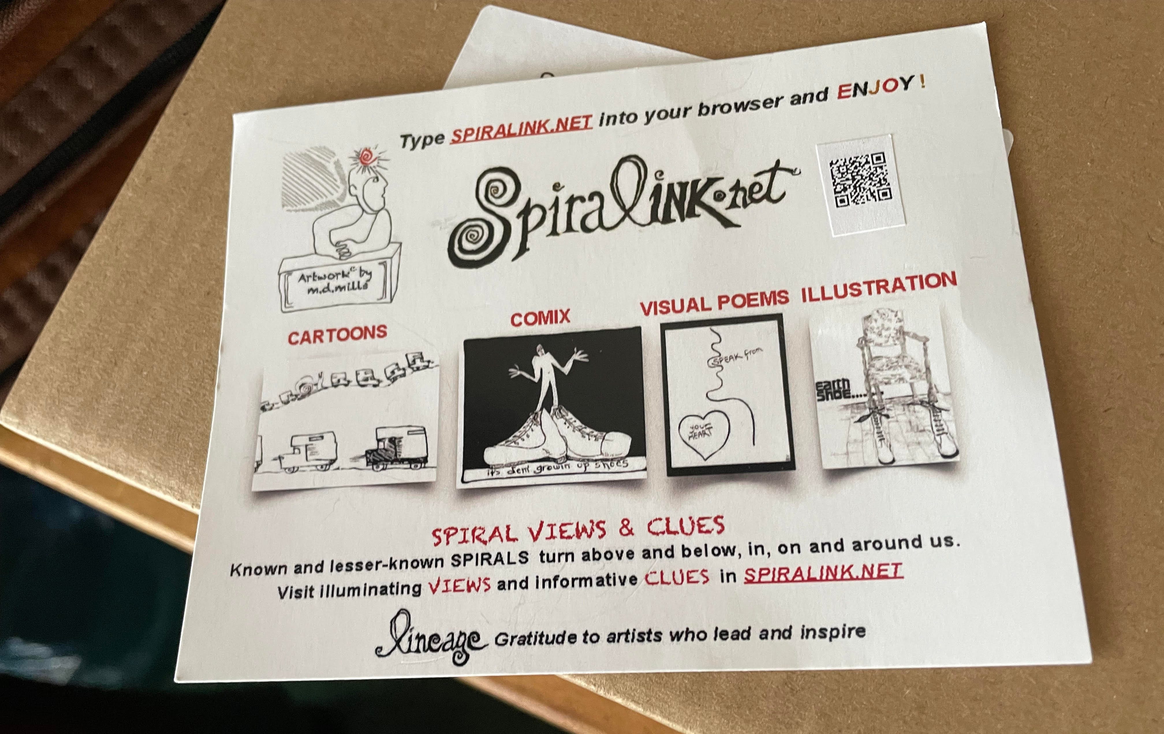 I ran into Marghe Mills-Thysen in Michael Carnacchi’s boot shop this week. Mills-Thysen was a member of the City of Sebastopol’s Public Arts Committee for more than 12 years, before she retired last July. Now that she’s no longer on the Arts Committee, she’s spending a lot of time in her garden—and at her drawing board. Her website spiralink.net features her cartoons, visual poems, and illustrations.