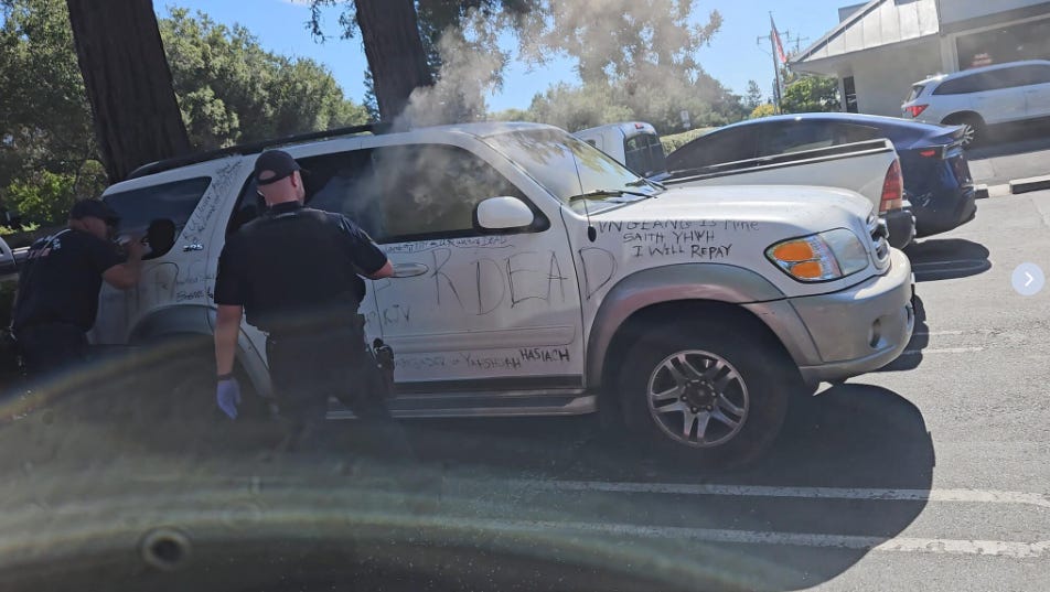 The car, which was inked with religious and political musings, had been parked in various locations in the Lucky’s parking lot all week. The owner, a woman, was not in the vehicle at the time of the fire and no one was hurt.