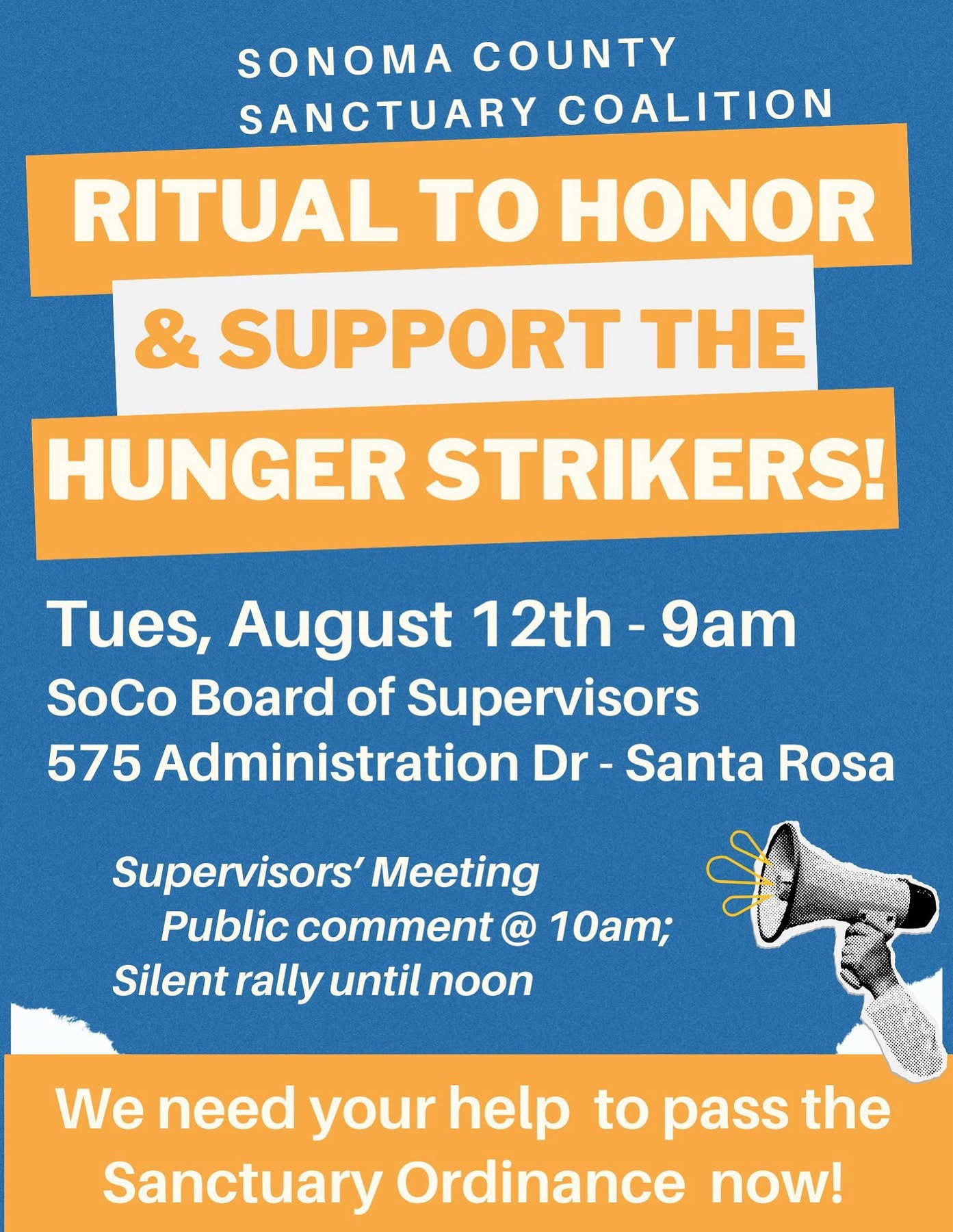Today marks the end of the “Hunger Strike for a Sanctuary County” at the Sonoma County Administration Building in Santa Rosa. The hunger strike, which began last Tuesday, will end with a ritual at 9 am this morning so that participants and their supporters can make their case to the Sonoma County Board of Supervisors during public comment at its August 12 board meeting.