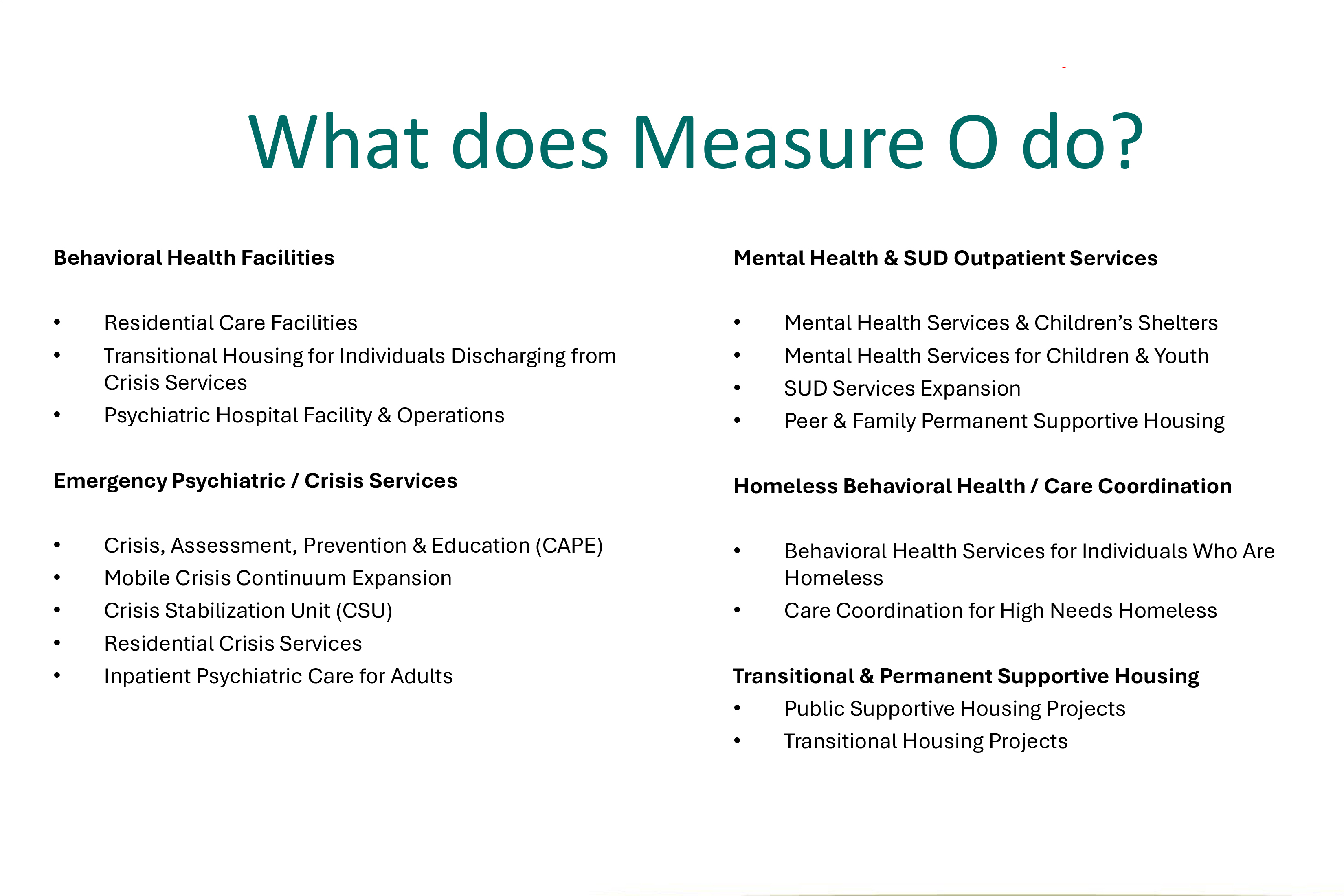 Sulllivan also announced that the county was releasing a NOFA (Notice of Funding Availability) for $10,000,000 in Measure O Funds. Cities, nonprofits and service providers offering homelessness and mental health services can apply for Measure O funds if they have program that fits the criteria. (See the NOFA here.)