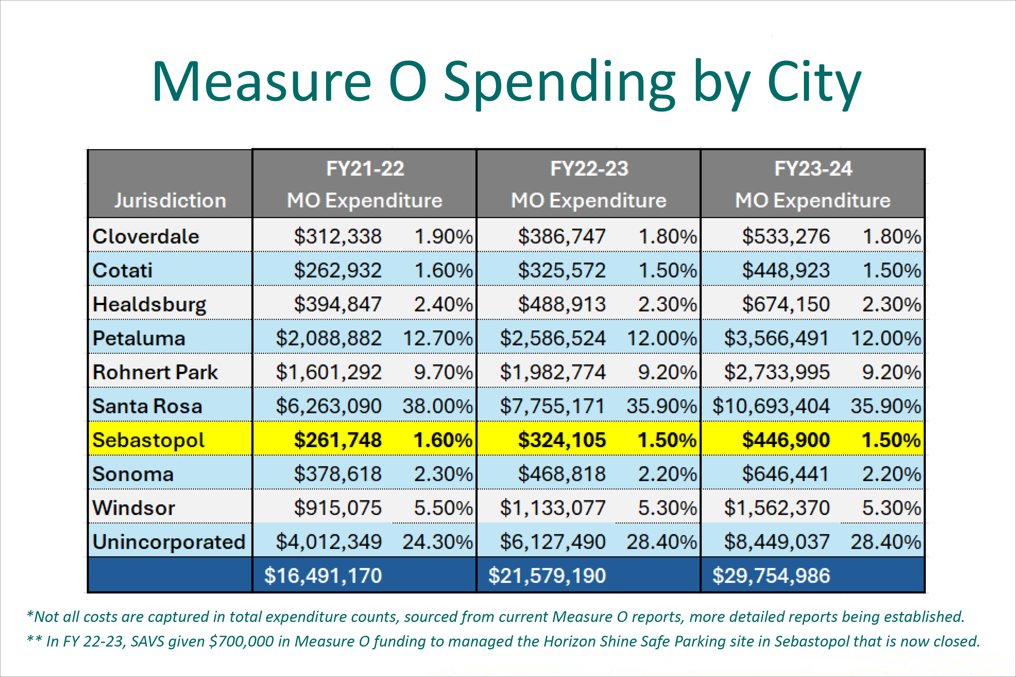 The $1MM in measure O money spent in Sebastopol during the last three years raises even more questions. The table heading says "Spending by City". When confronted with the fact that no one in the city was aware of $1million dollars in mental health services, someone said it was some sort of allocation not actual spend. There was also a reference to $700,000 spending on Horizon Shine but is closed prior to most of the funds shown in the table. The notice that we have to apply for next year's measure O funding and only have 2 days to do it was fun. Maybe, the county did not get the message we don't have a team of people in the city working on this. We barely have anyone working on anything at this point with vacancies. Mary Gourley is doing great work but there are limits.