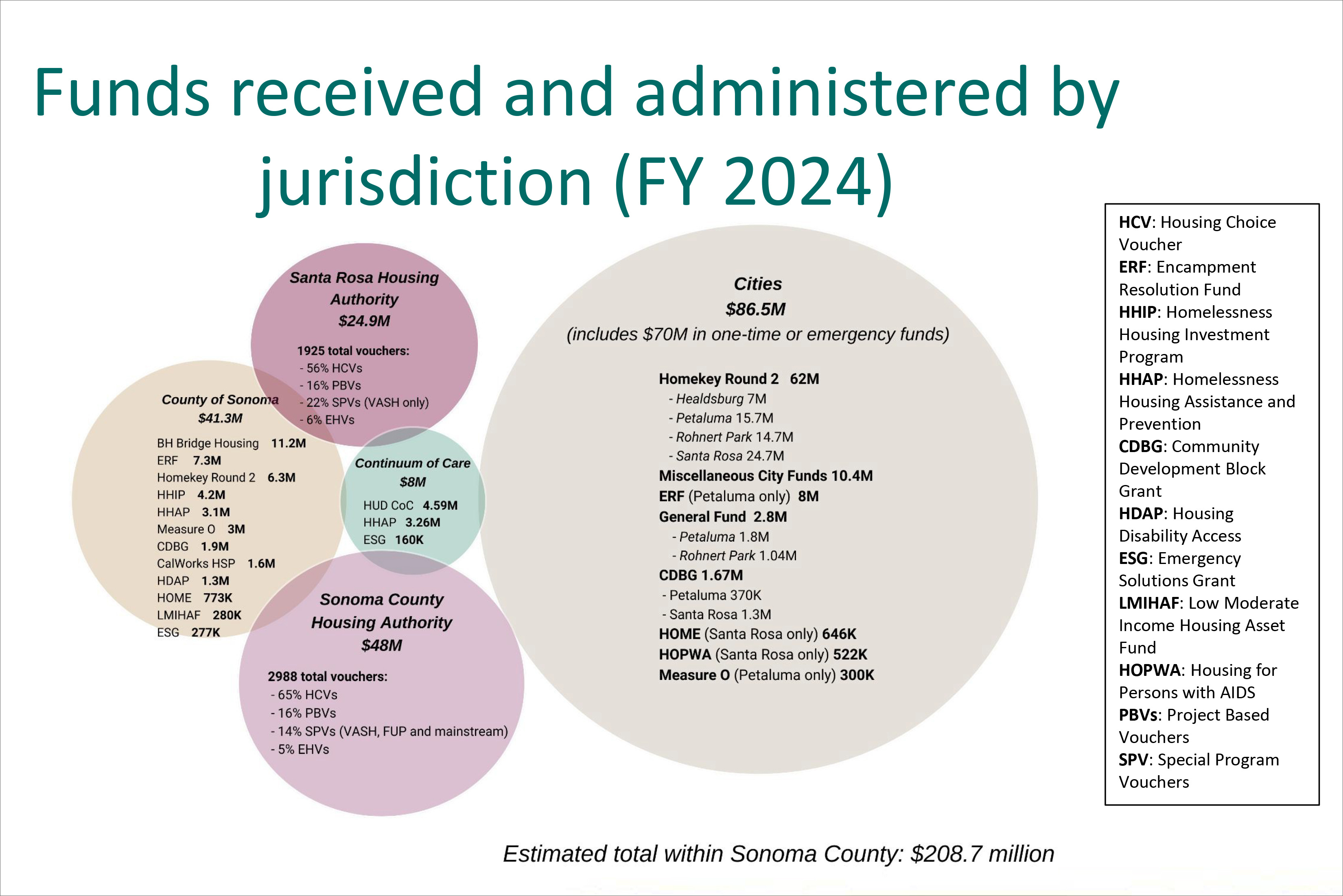 “So if you look there on the upper left hand side, you’ve got Santa Rosa housing authority. So they mainly do vouchers and public support housing. If you look on the lower left there, the kind of brown circle, you've got County of Sonoma, all of our different programs. If you look there at the little green bubble, that's the Continuum of Care, that's those COC and HUD funds that roll through there. If you look at Sonoma County Housing Authority, this is all the folks that are using Section 8 vouchers across the county. And if you look on the right, these are all the investments the cities in Sonoma County are making into homeless services.”