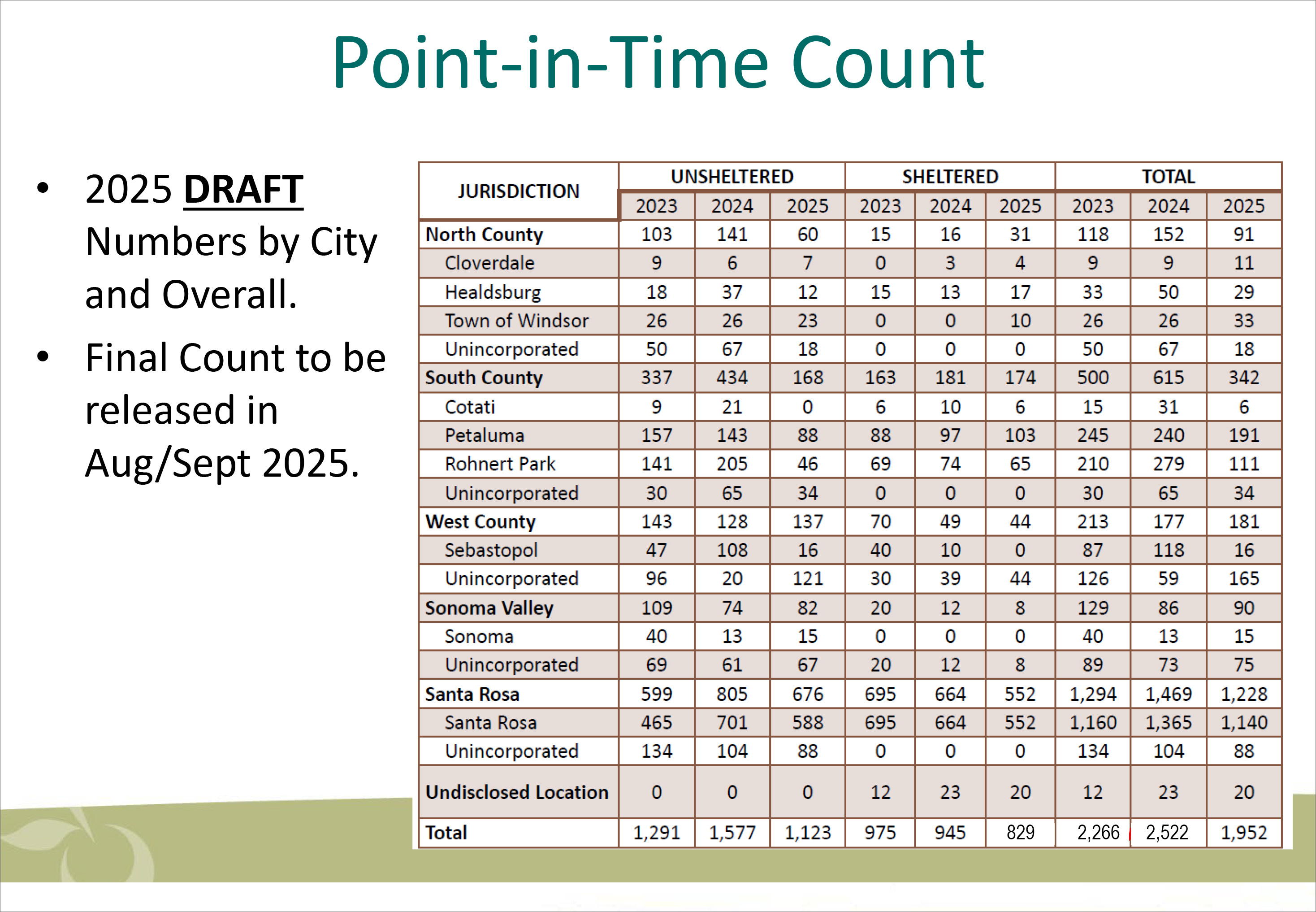 The draft Point-in-Time Count for Sebastopol lists the number of homeless individuals for 2025 at 16.