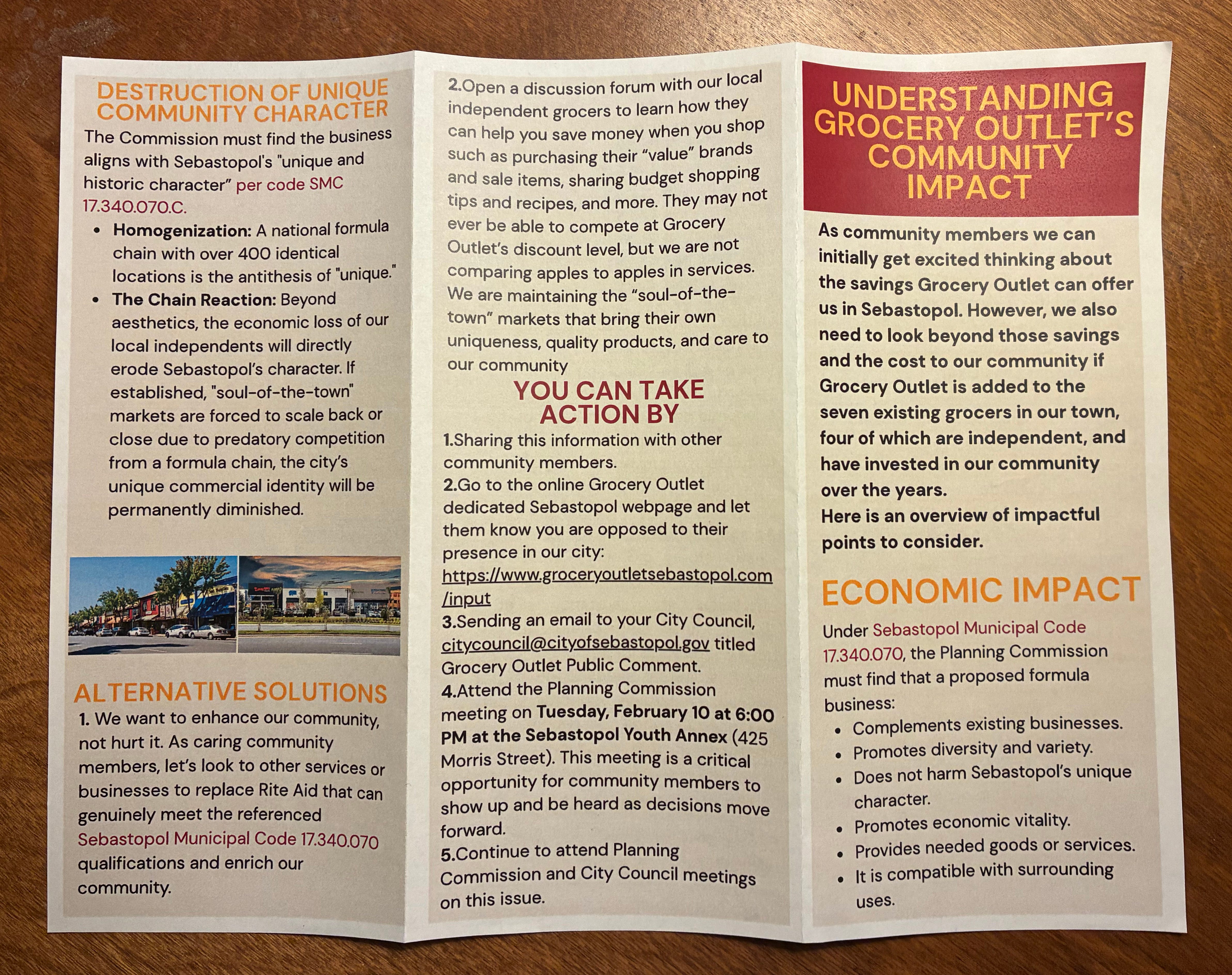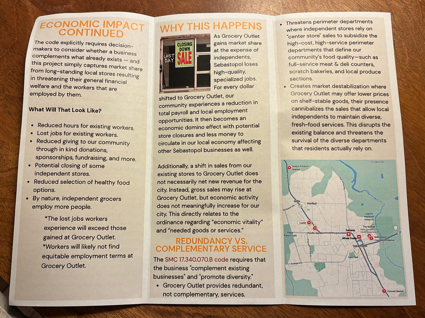 The flyer makes a strong case that Grocery Outlet violates the spirit and the letter of Sebastopol’s Formula Business Ordinance, which was designed to keep chain stores out of downtown.